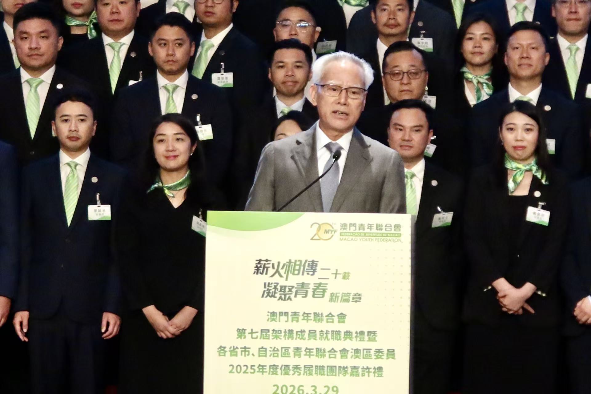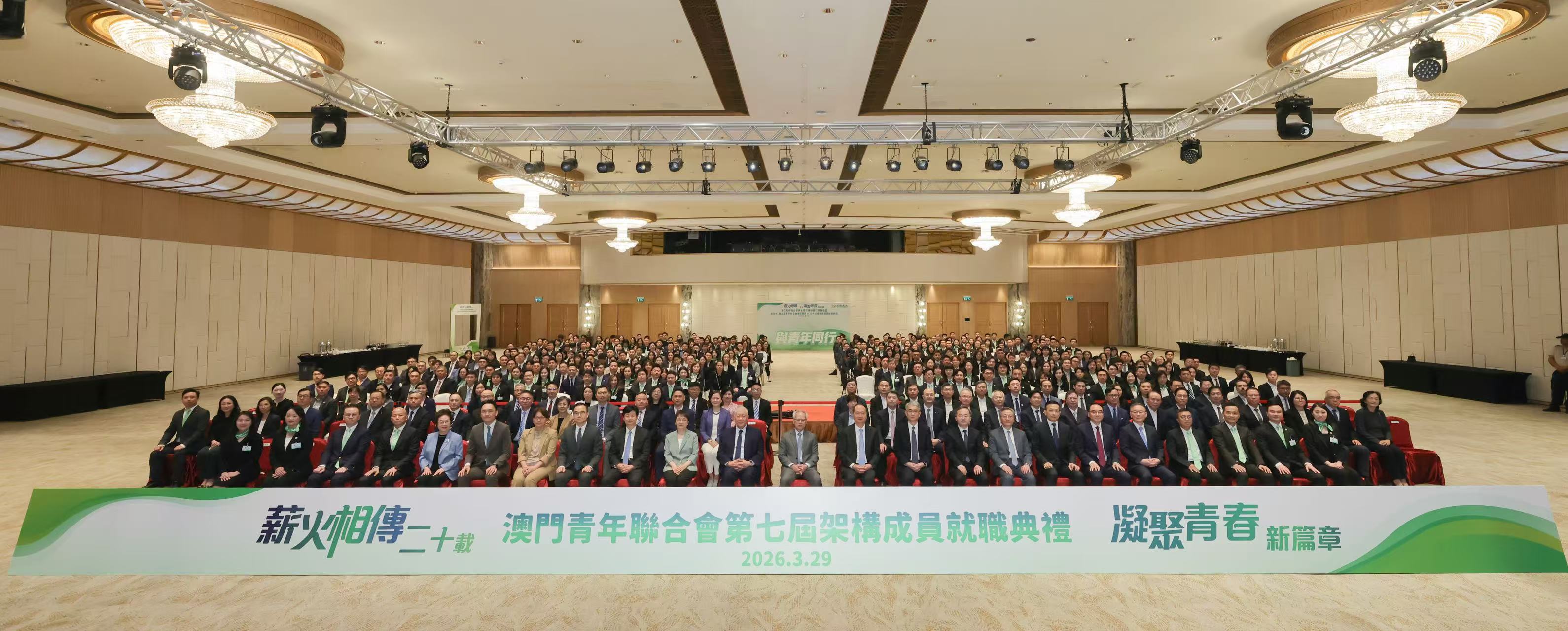 【即時新聞】澳門青年聯合會舉行成立二十週年慶典暨第七屆架構成員就職典禮,行政長官岑浩輝、全國政協副主席何厚鏵、中聯辦主任鄭新聰、外交公署特派員卞立新、立法會主席張永春 等嘉賓出席見證。