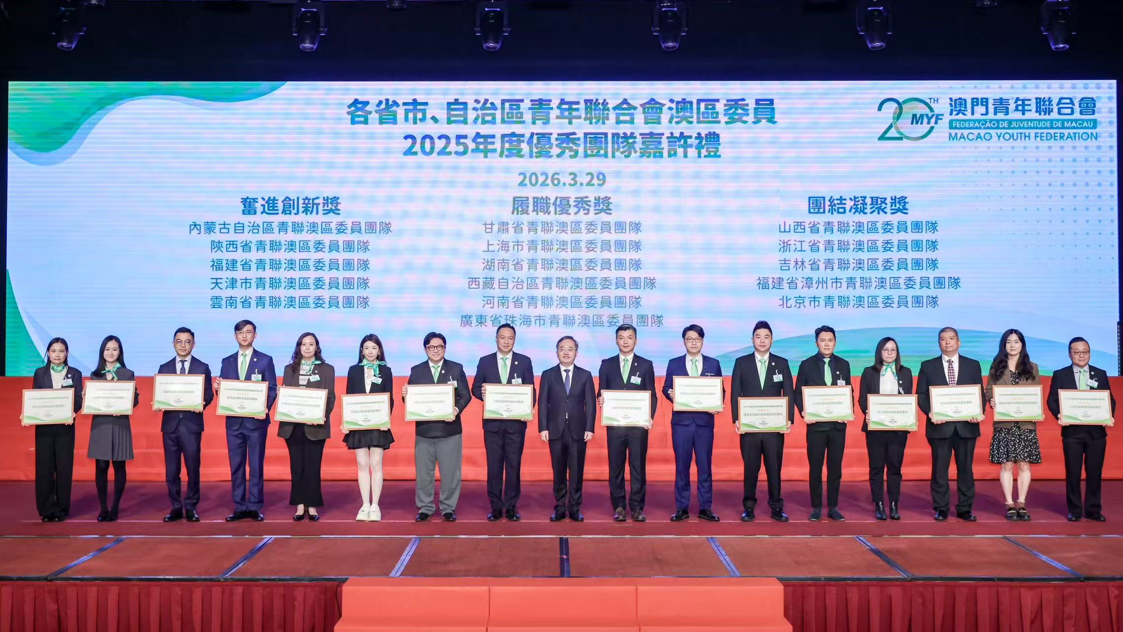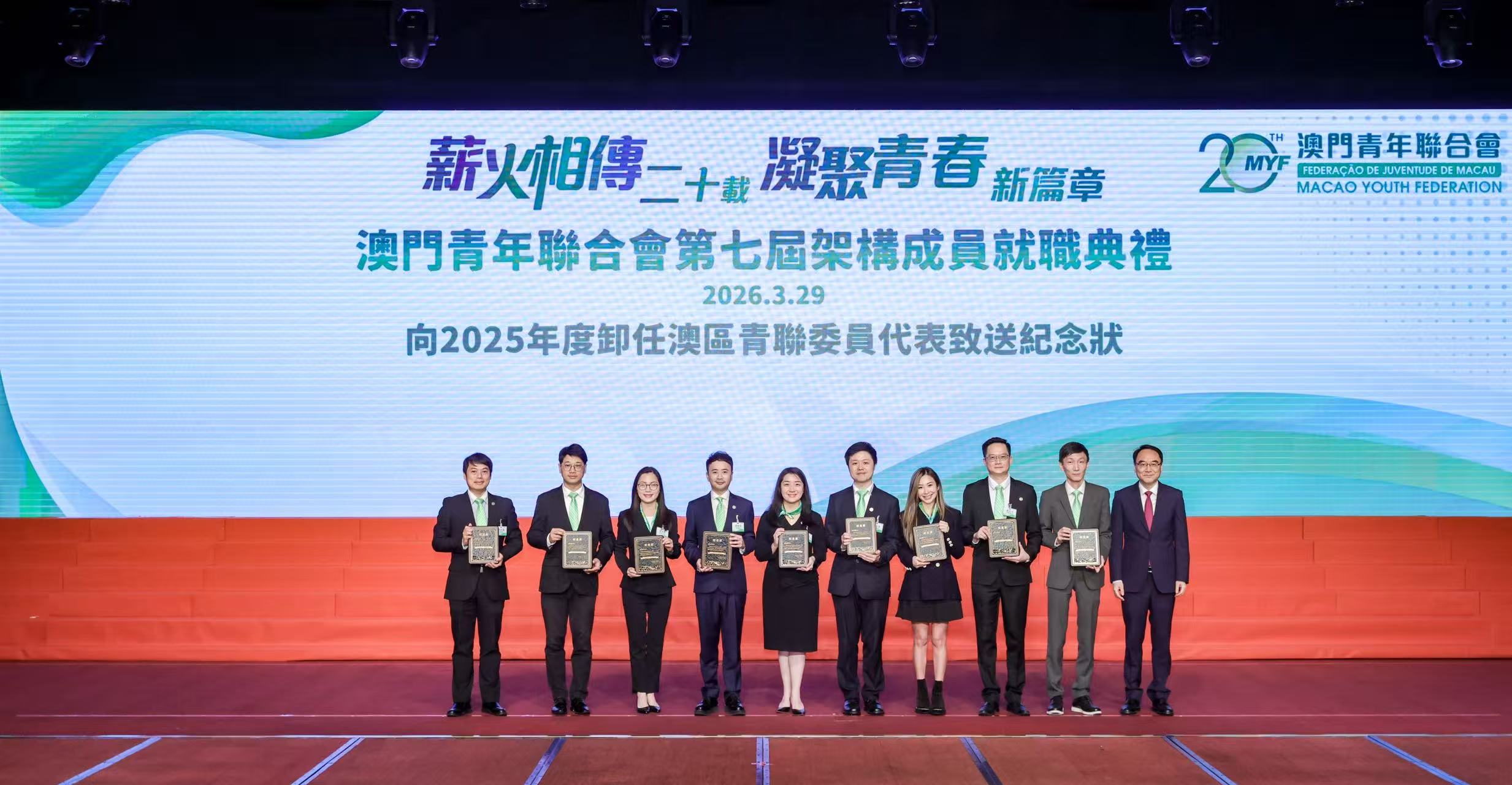 典禮上,在全國人大常委、澳門青聯發起人高開賢監誓下,第七屆架構成員宣誓就職。同場嘉許2025年度澳區青聯委員團隊,中華全國青年聯合會秘書長李迪為獲獎團隊頒獎並作出勉勵。其中“履職優秀獎”由甘肅省、上海市、湖南省、西藏自治區、河南省及廣東省珠海市青聯澳區委員團隊獲得;“奮進創新獎”由內蒙古自治區、陝西省、福建省、天津市及雲南省青聯澳區委員團隊獲得;“團結凝聚獎”由山西省、浙江省、吉林省、福建省漳州市、北京市青聯澳區委員團隊獲得。隨後,中聯辦教青部部長李雪飛向9位卸任委員頒發紀念狀,感謝他們對青年工作的無私奉獻。