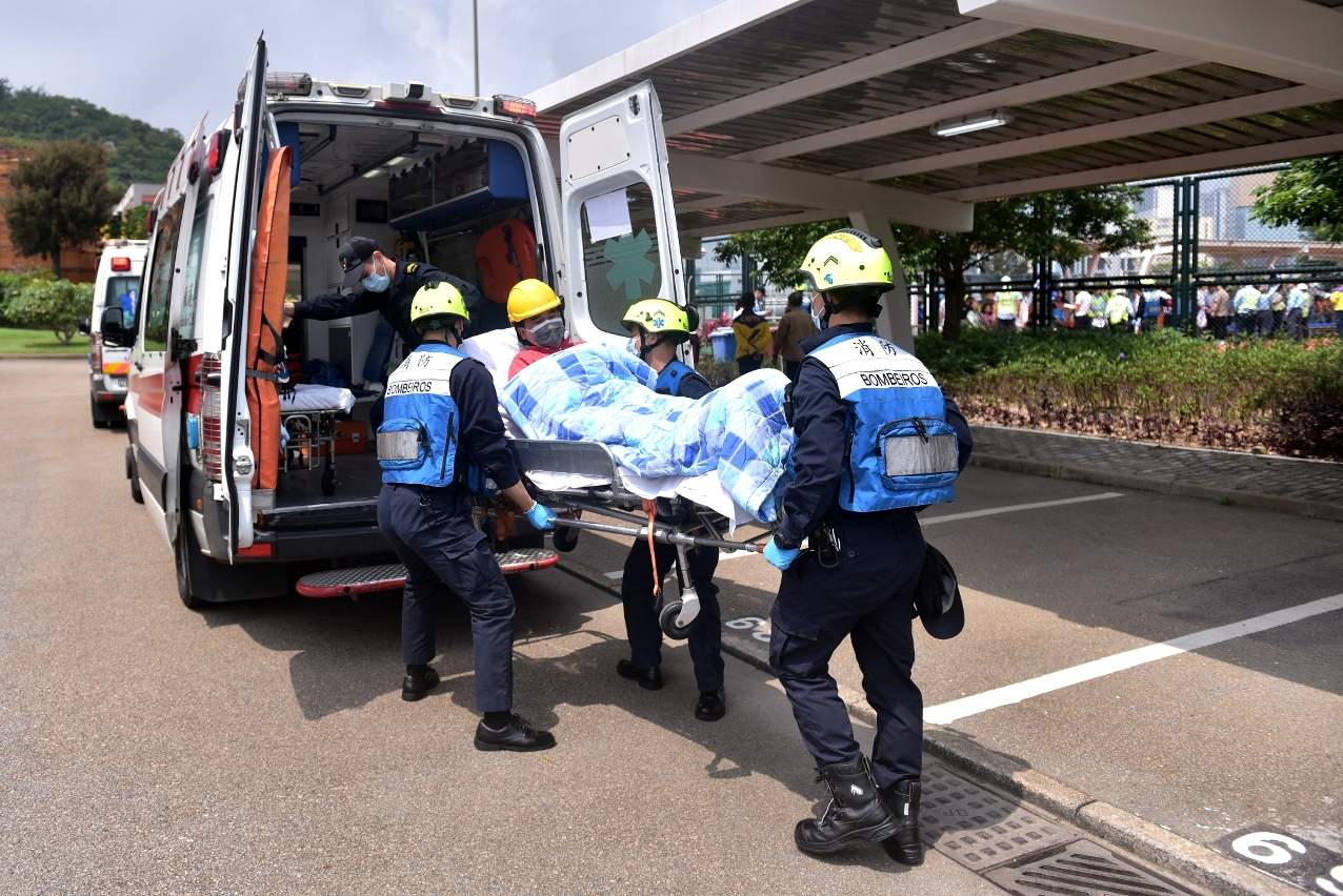 消防局接報後,隨即派遣6輛緊急車輛及28名人員趕赴現場,按照既定行動預案展開滅火救援及疏散工作。同時,救護員在疏散集合點清點人數,並對一名疏散期間受傷的員工進行護理後模擬送院。