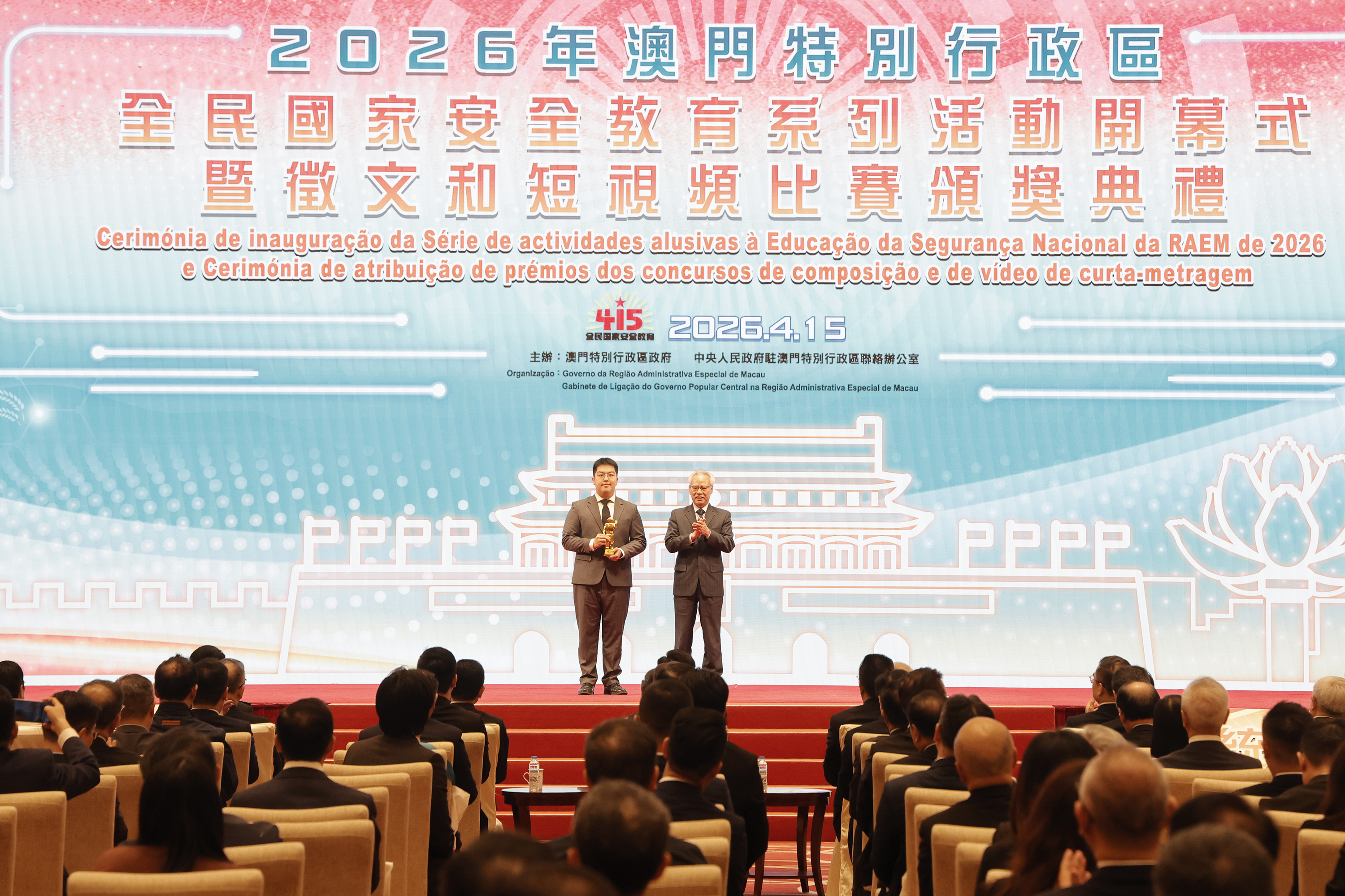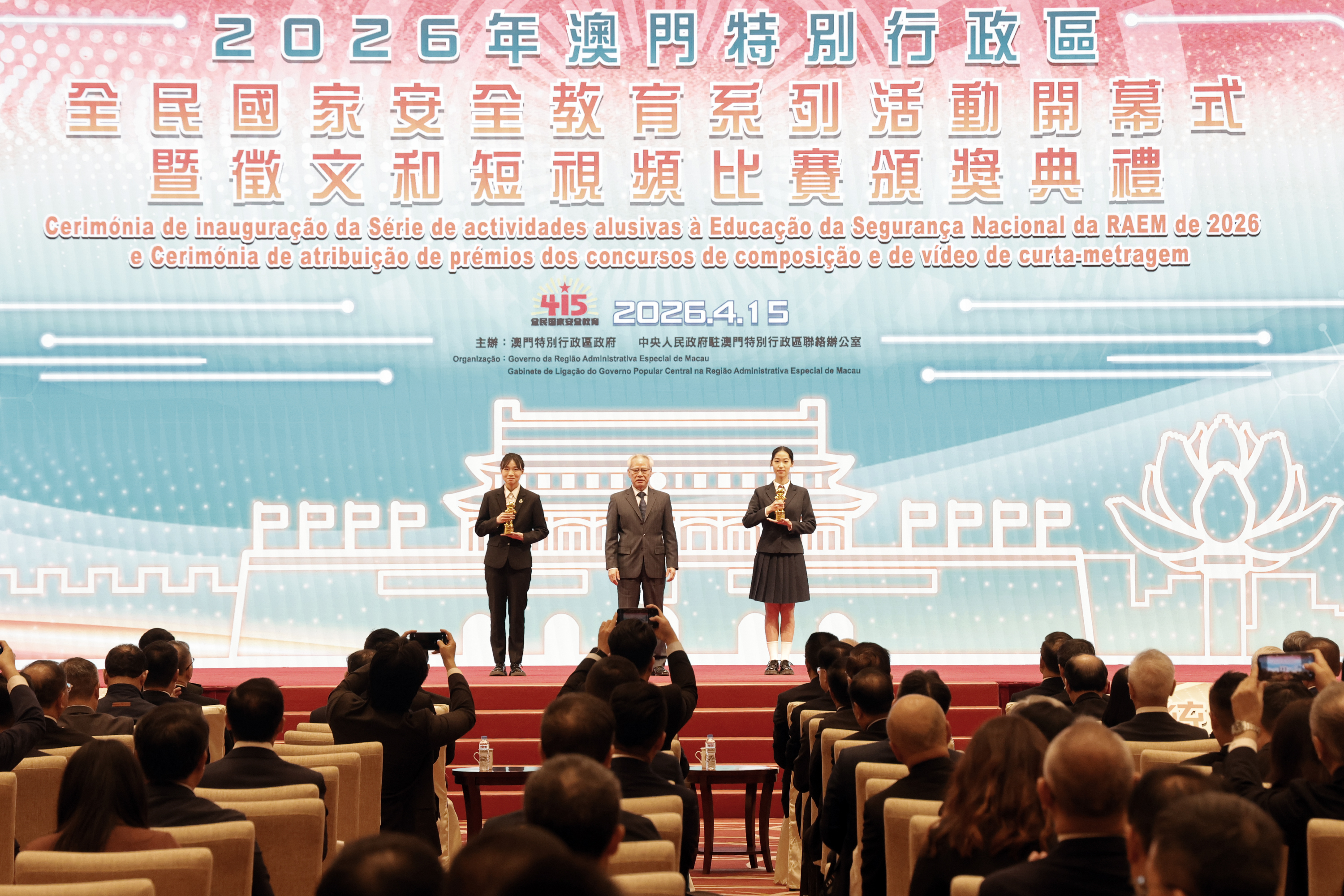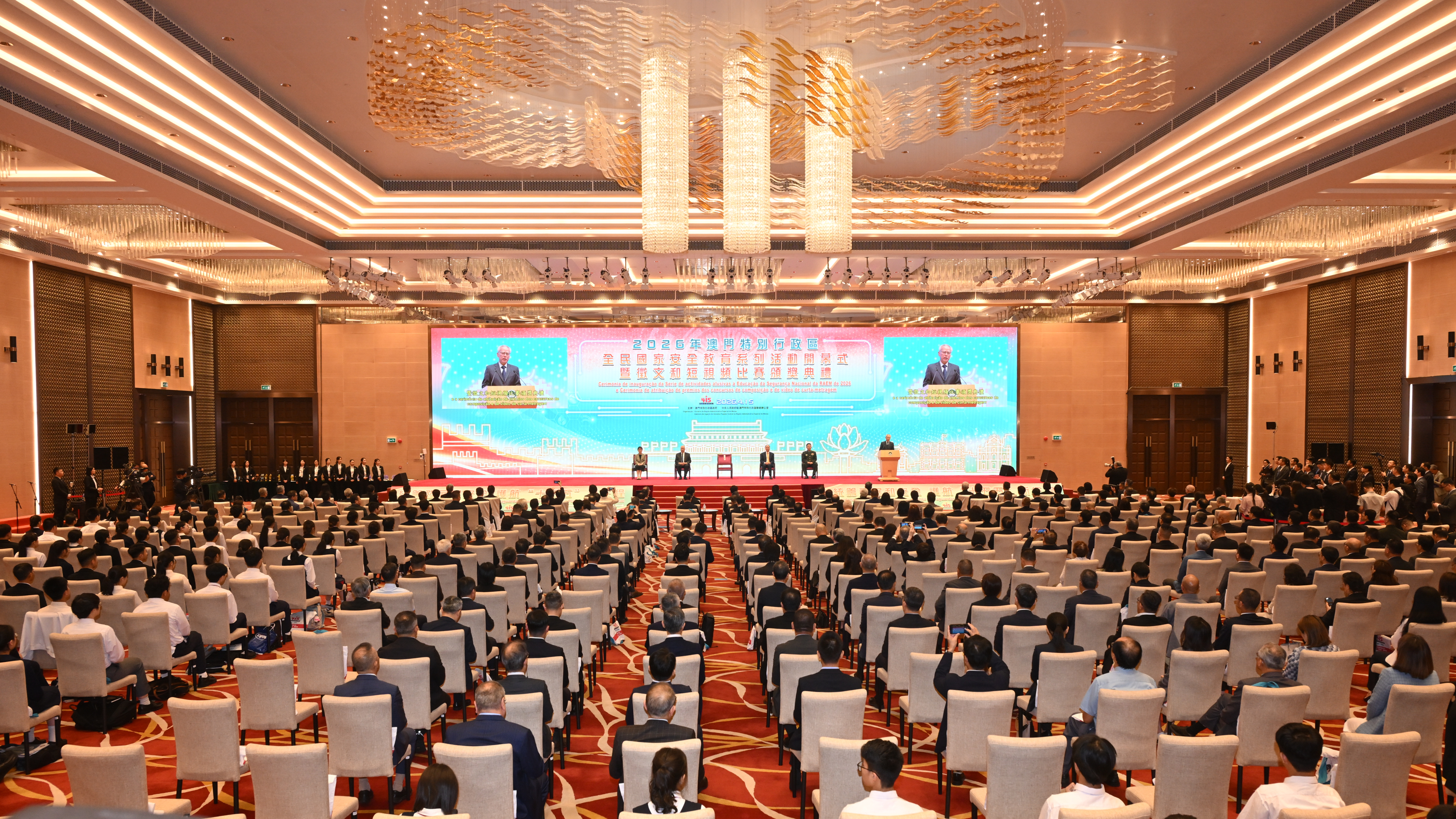 【即時新聞】全民國家安全教育系列活動開幕式暨徵文和短視頻比賽頒獎典禮傍晚舉行,行政長官、澳門特別行政區維護國家安全委員會主席岑浩輝等出席主禮。活動上,嘉賓向全民國家安全教育系列徵文和短視頻比賽獲獎學生頒發獎項。
