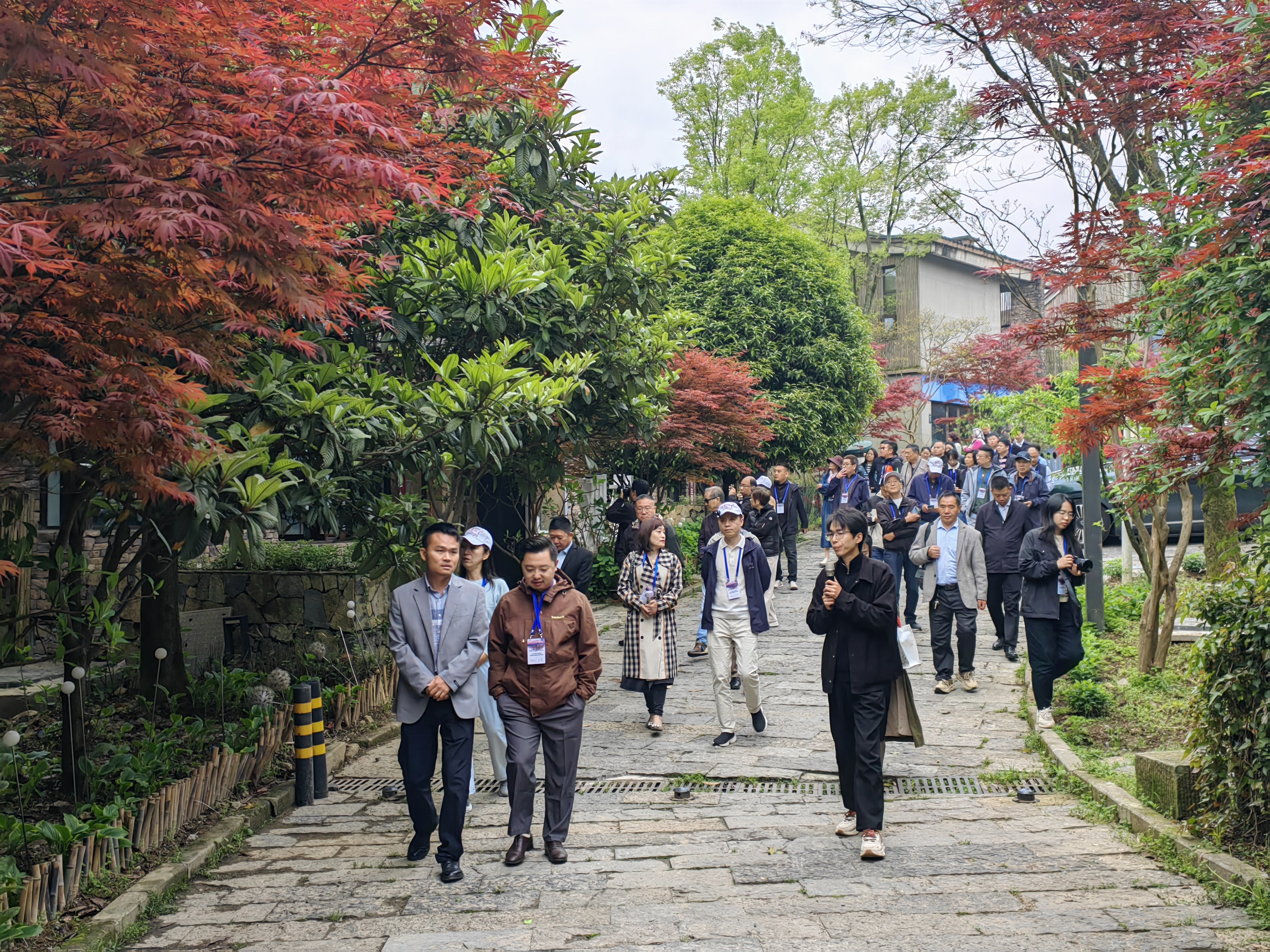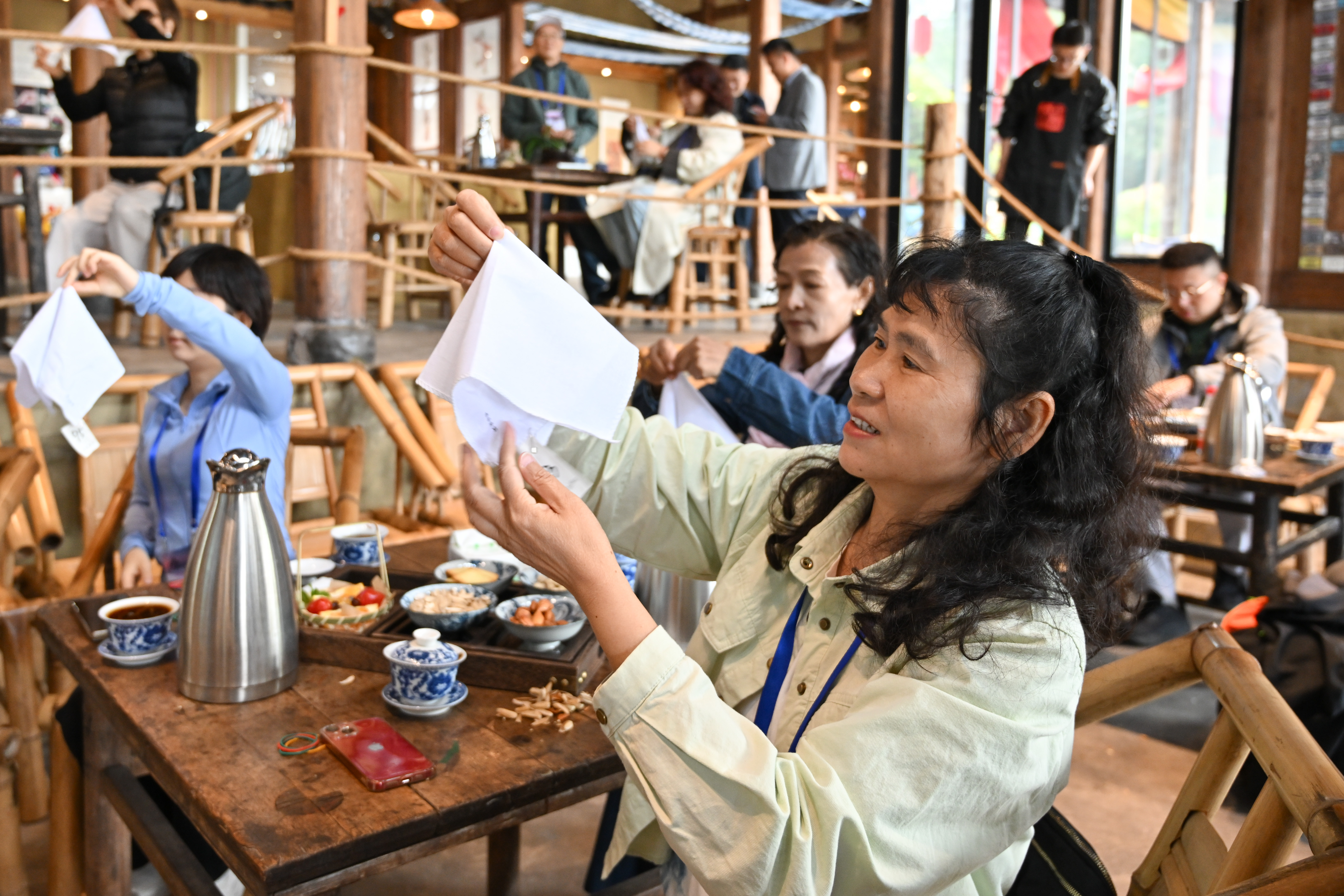 歸原小鎮透過「田園 + 莊園 + 樂園」的建設模式,集農業產業、文創旅遊、鄉居社區為一體,以修舊如舊的手法改建原老房子為特別的公共文化或服務空間。其中歸原茶館被譽為「高山版的交通茶館」,最大限度地保留了老宅的實木骨骼與歲月痕跡,斑駁的木梁、清一色的方桌竹椅、幾十把溫潤的銅壺與上百隻青花瓷杯,共同營造出質樸而溫暖的氛圍,是體驗「慢生活」的好場所。參訪團成員在茶館品茶,並近距離體驗土家族扎染等非物質文化遺產技藝,感受少數民族傳統文化的獨特魅力;鎮內還有依山而建的無有圖書館,憑藉新穎獨特的設計理念,成為備受遊客青睞的網紅文化地標,展現出鄉村文旅的文藝內涵與時代氣息。