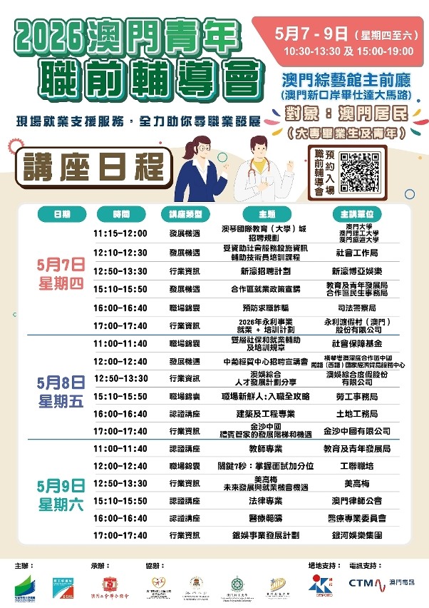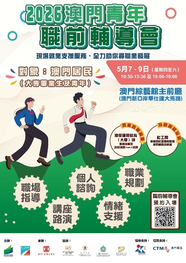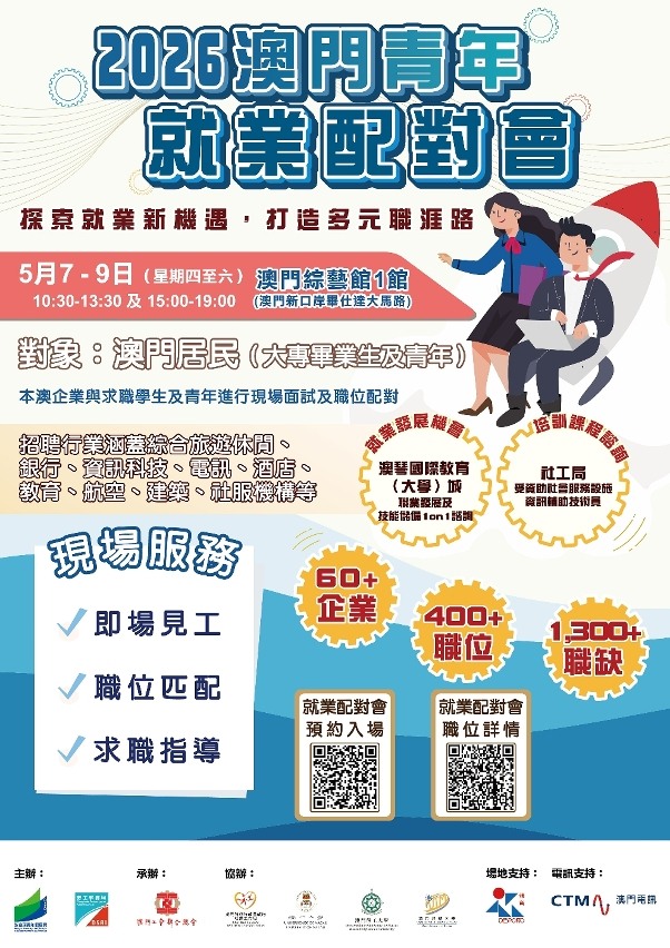 【即時新聞】為協助澳門青年順利開展職業生涯及投入就業巿場,由教育及青年發展局和勞工事務局主辦、澳門工會聯合總會承辦的2026“澳門青年就業配對會”(下稱配對會)及“澳門青年職前輔導會”(下稱職輔會),將於2026年5月7日至9日一連三日於澳門綜藝館舉行。配對會及職輔會兩項活動由2026年4月21日起可於網上預約及報名。