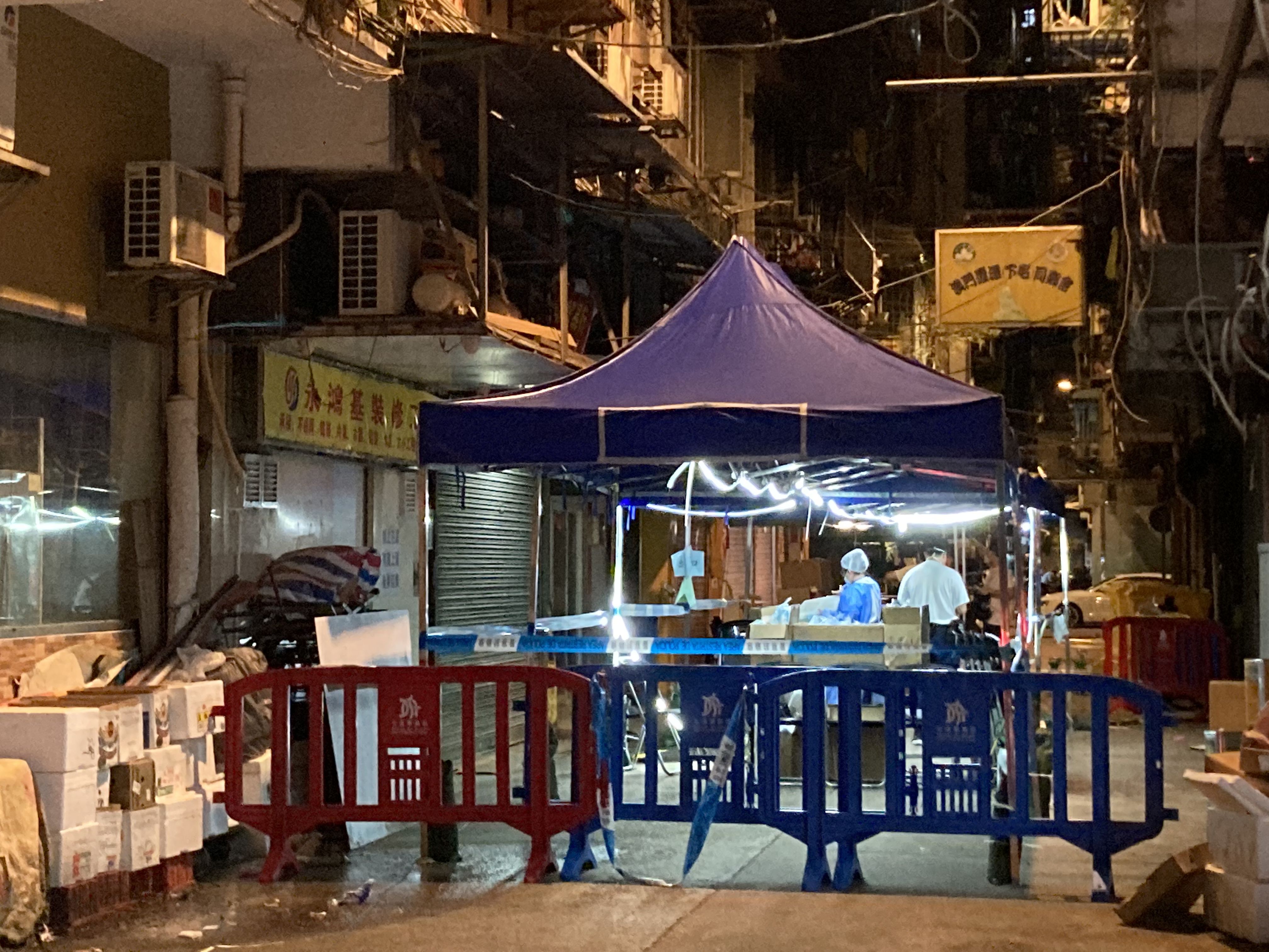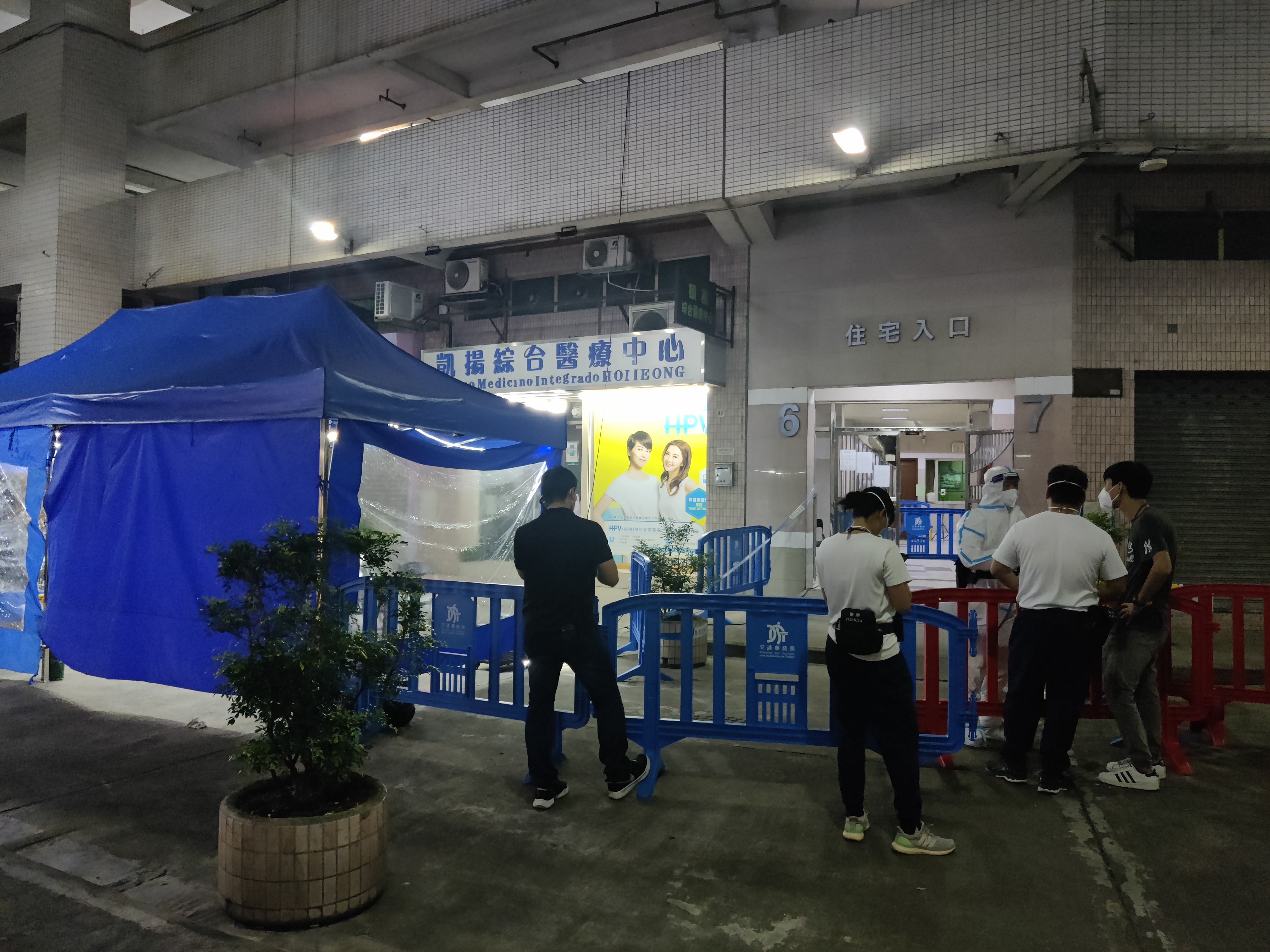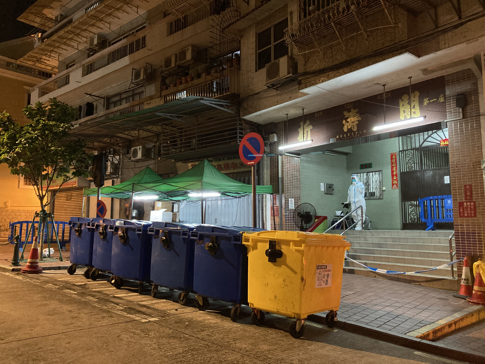 【即時新聞】應變協調中心公佈,今日新增五個紅碼區,包括祐漢新村第一街56至62號、第二街57至63號、第七街30至42號吉祥樓一帶,風順堂上街的新濤閣第一座,以及黑沙環中街的廣福安花園第六座和第七座。現場所見,被列為紅碼區的大廈已用圍欄及封條封鎖,大廈門口有穿著防護衣的防疫人員駐守,旁邊有亦有架起帳篷設置物質配送點。