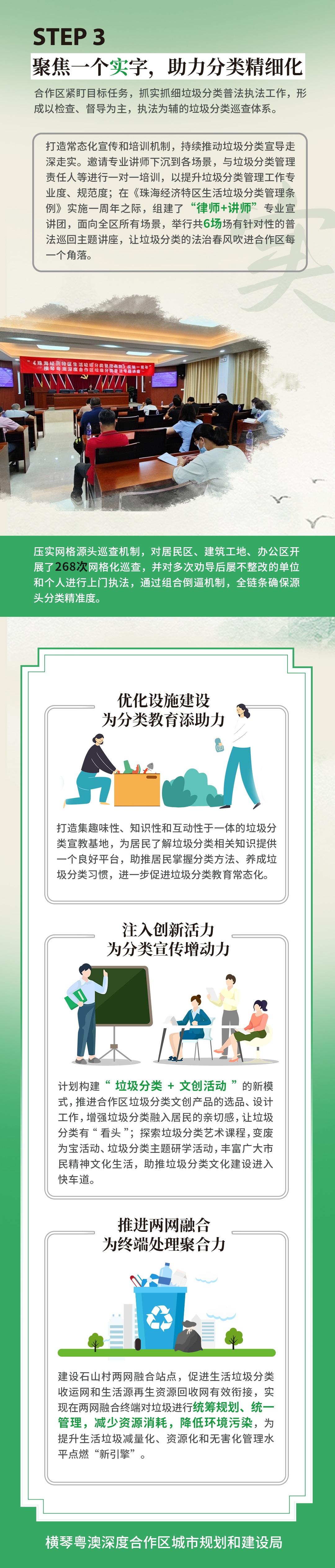 局方以建設粵港澳大灣區垃圾分類先行地為總抓手,常抓不懈推進垃圾分類工作提質增效。下階段將致力三方面工作:一、優化設施建設,為分類教育添助力。打造集趣味性、知識性和互動性於一體的垃圾分類宣教基地,為居民瞭解垃圾分類相關知識提供一個良好平台,助推居民掌握分類方法、養成垃圾分類習慣,進一步促進垃圾分類教育常態化。二、注入創新活力,為分類宣傳增動力。計劃構建“垃圾分類+文創活動”的新模式,推進合作區垃圾分類文創產品的選品、設計工作,增強垃圾分類融入居民的親切感,讓垃圾分類有“看頭”;探索垃圾分類藝術課程,變廢為寶活動、垃圾分類主題研學活動,豐富廣大市民精神文化生活,助推垃圾分類文化建設進入快車道。三、推進兩網融合,為終端處理聚合力。建設石山村兩網融合網站,促進生活垃圾分類收運網和生活源再生資源回收網有效銜接,實現在兩網融合終端對垃圾進行統籌規劃、統一管理,減少資源消耗,降低環境污染,為提升生活垃圾減量化、資源化和無害化管理水準點燃“新引擎”。