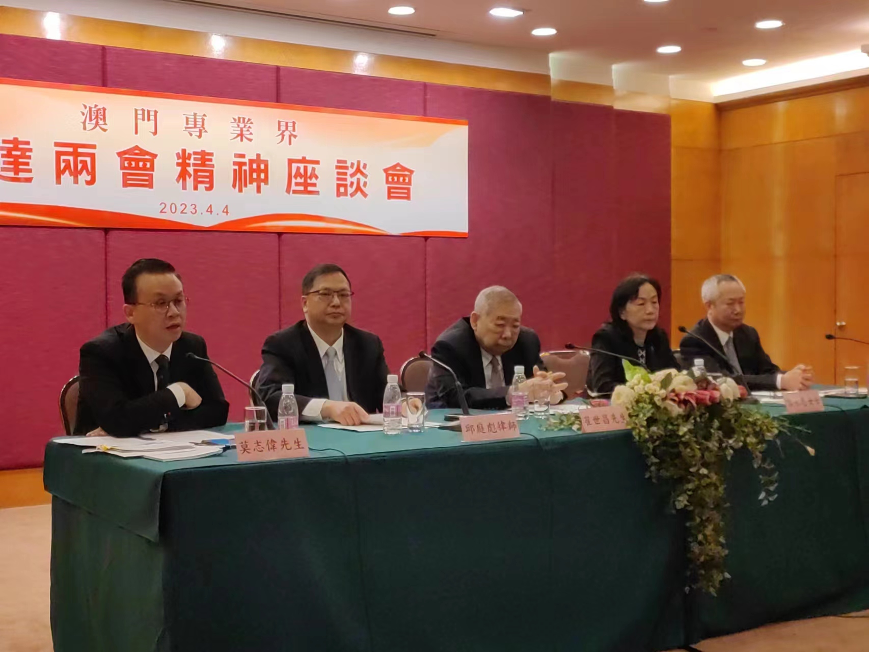 【即時新聞】澳門專業界傳達兩會精神座談會傍晚六時十五分假中總大廈四樓舉行,邀請澳區全國人大代表容永恩、蕭志偉,全國政協常委崔世昌,全國政協澳區委員邱庭彪及莫志偉分享兩會內容,領會兩會精神,多個專業協會代表出席。