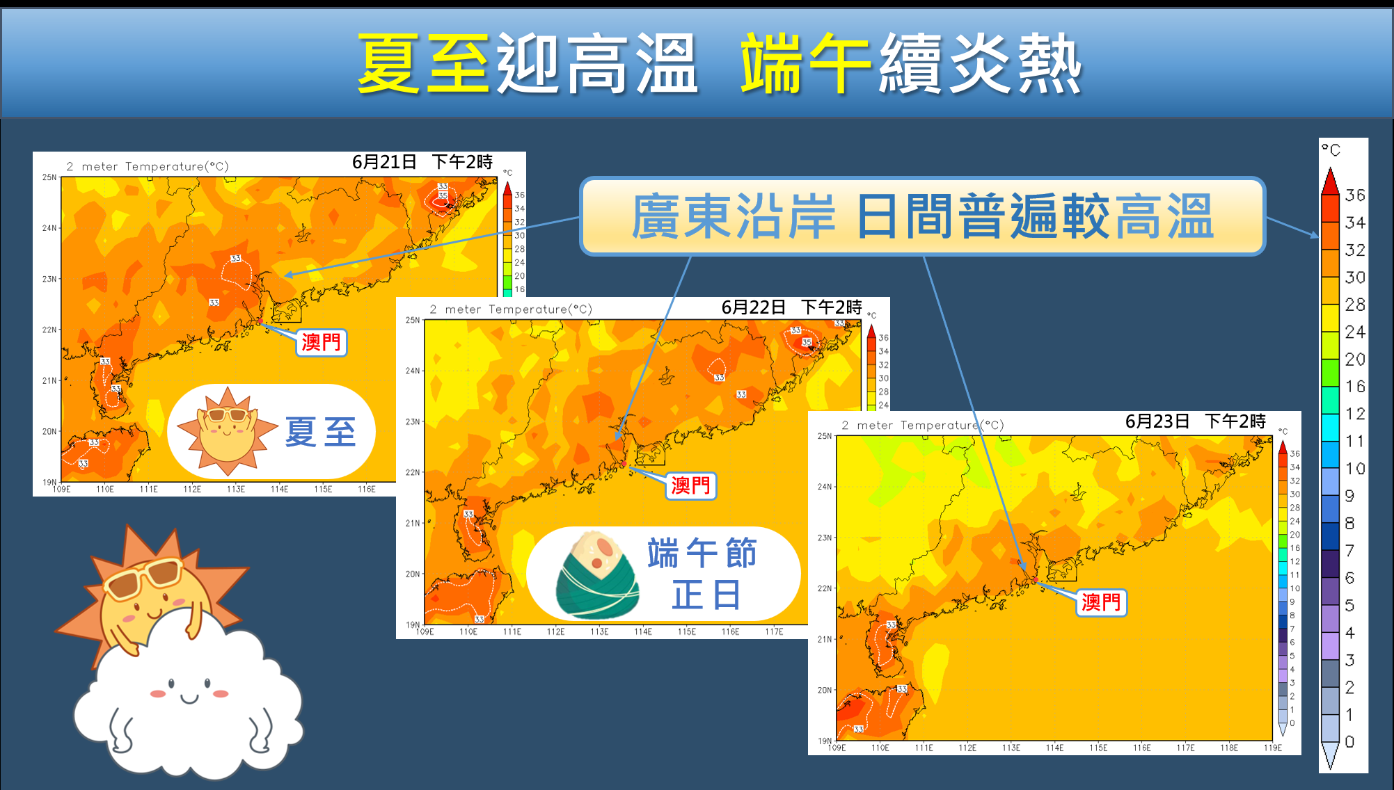 由地面氣溫預報圖可見,未來數日廣東沿岸日間最高氣溫可達32℃至34℃,本澳日間部份地區亦有機會達至酷熱。但受西南季風的影響,會偶有幾陣驟雨稍助消暑降溫。市民外出活動時,記得帶備雨傘,以及多補充水分。
