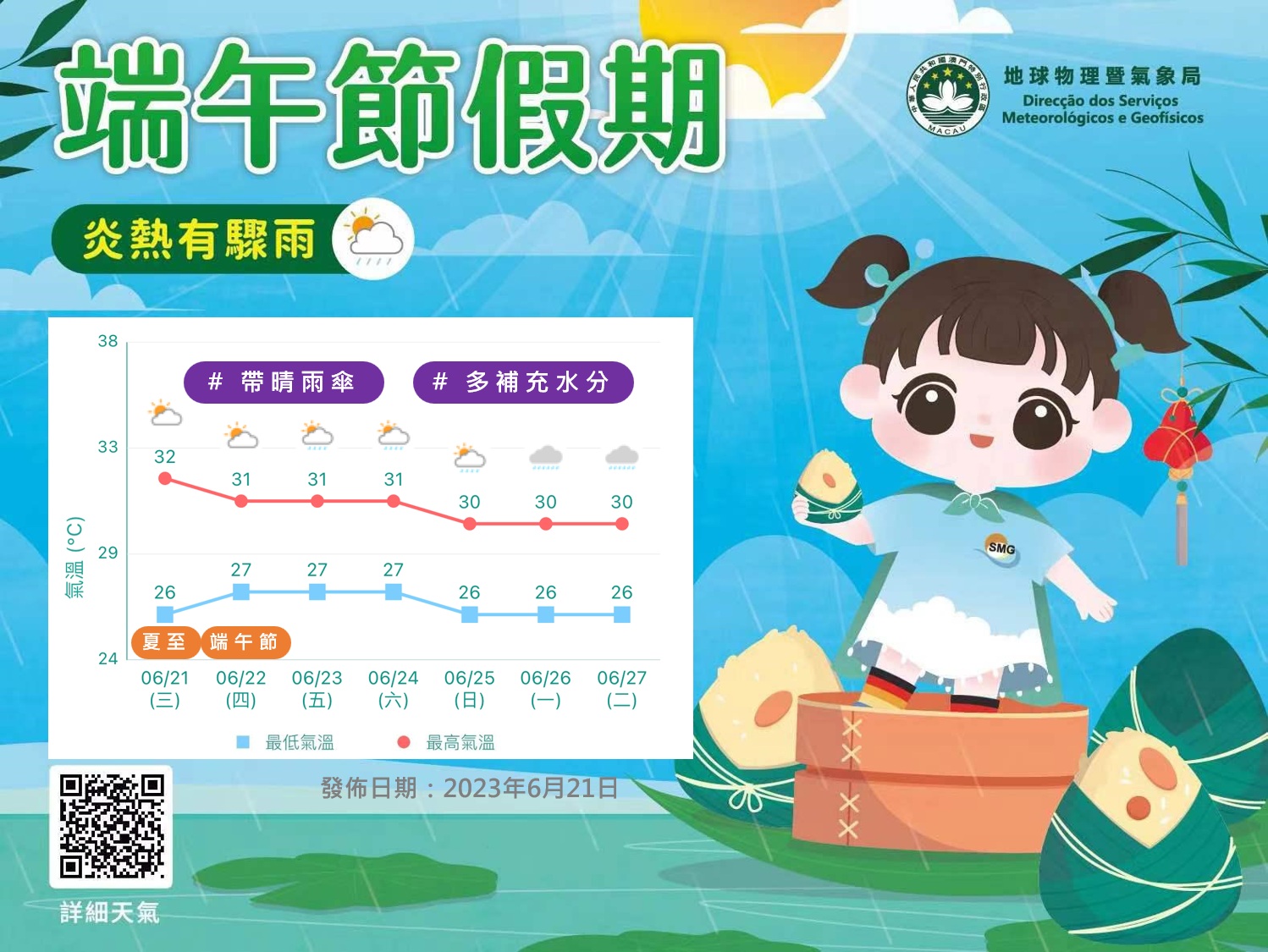 【即時新聞】氣象局表示,持續受副熱帶高壓脊及西南季風的共同影響,端午節假期日間炎熱有陽光,同時夾雜著一兩陣驟雨。