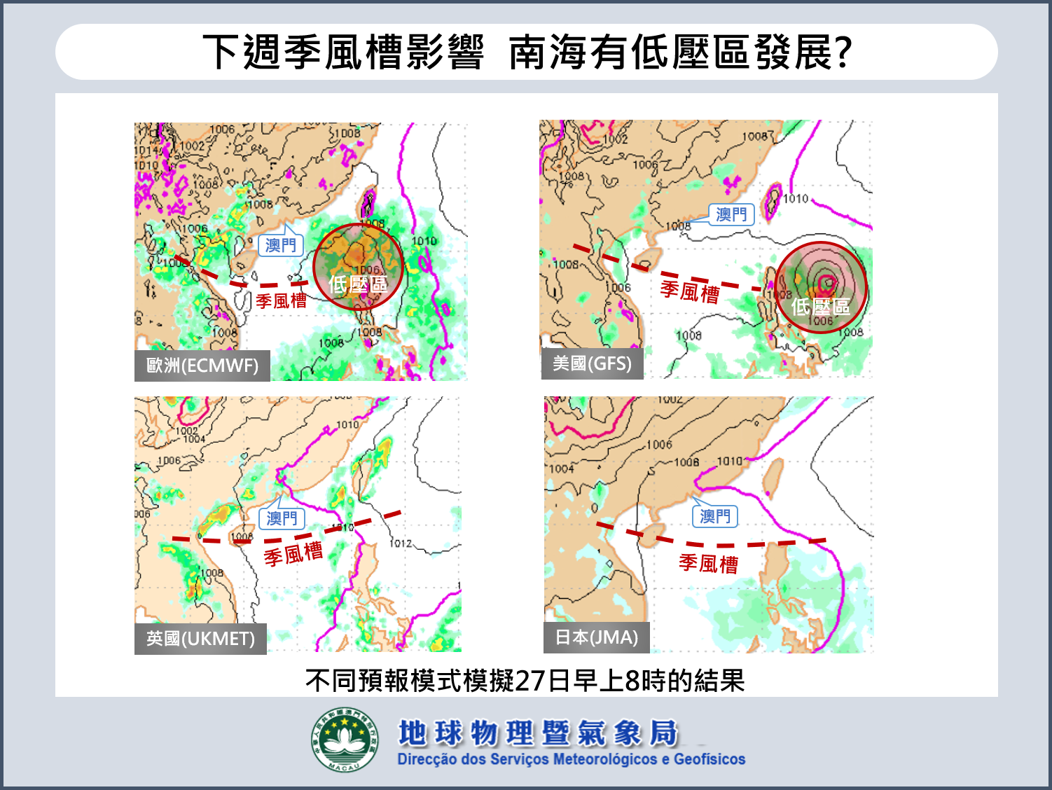 目前不同預報模式資料顯示,下週將有一道季風槽於南海中部至菲律賓一帶發展,並有一定機會發展成低壓區。隨著該季風槽移近,預料本澳下週中後期雲量及驟雨將會增多。由於預報時效較長,模式之間仍存在分歧,市民還需持續關注局方的最新天氣資訊。