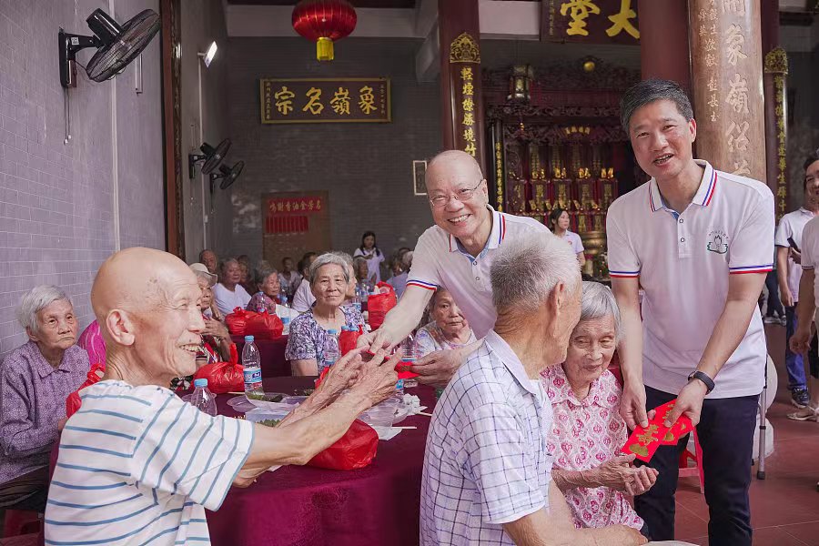 阮建昆及阮毓明在象角村阮氏大宗祠進行上香拜祭先祖後,向該村八十歲以上宗長們送贈利市和親切問候,場面溫馨。