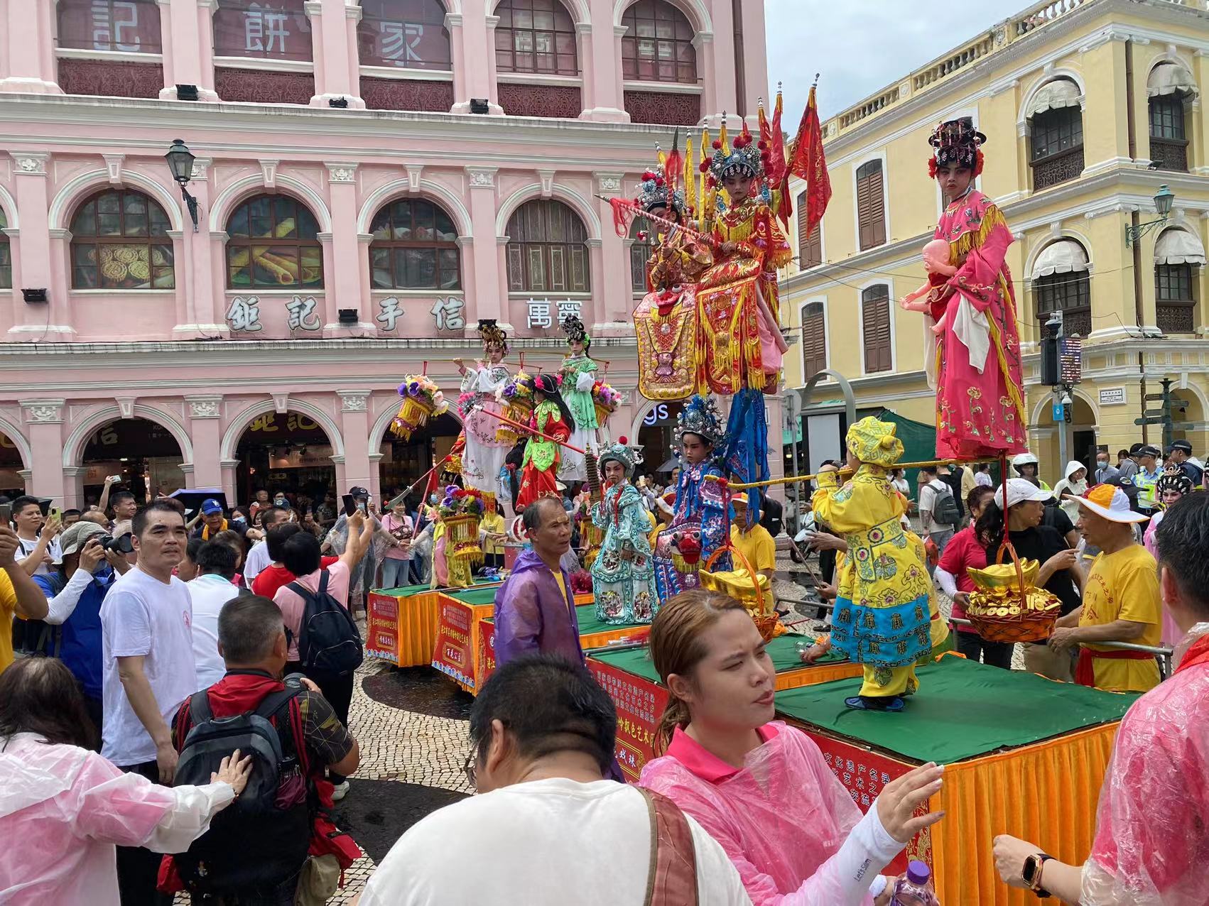 【即時新聞】明天農曆5月18日是哪吒誕,大三巴哪吒廟今舉行飄色巡遊,巡遊隊伍由大三巴牌坊出發至議事亭前地,並按指定路線返回該廟,期間隊伍向商戶及街坊、遊客等送福。儘管天降大雨,但現場氣氛高漲,吸引眾多居民和遊客駐足觀看,感受本地信俗文化。