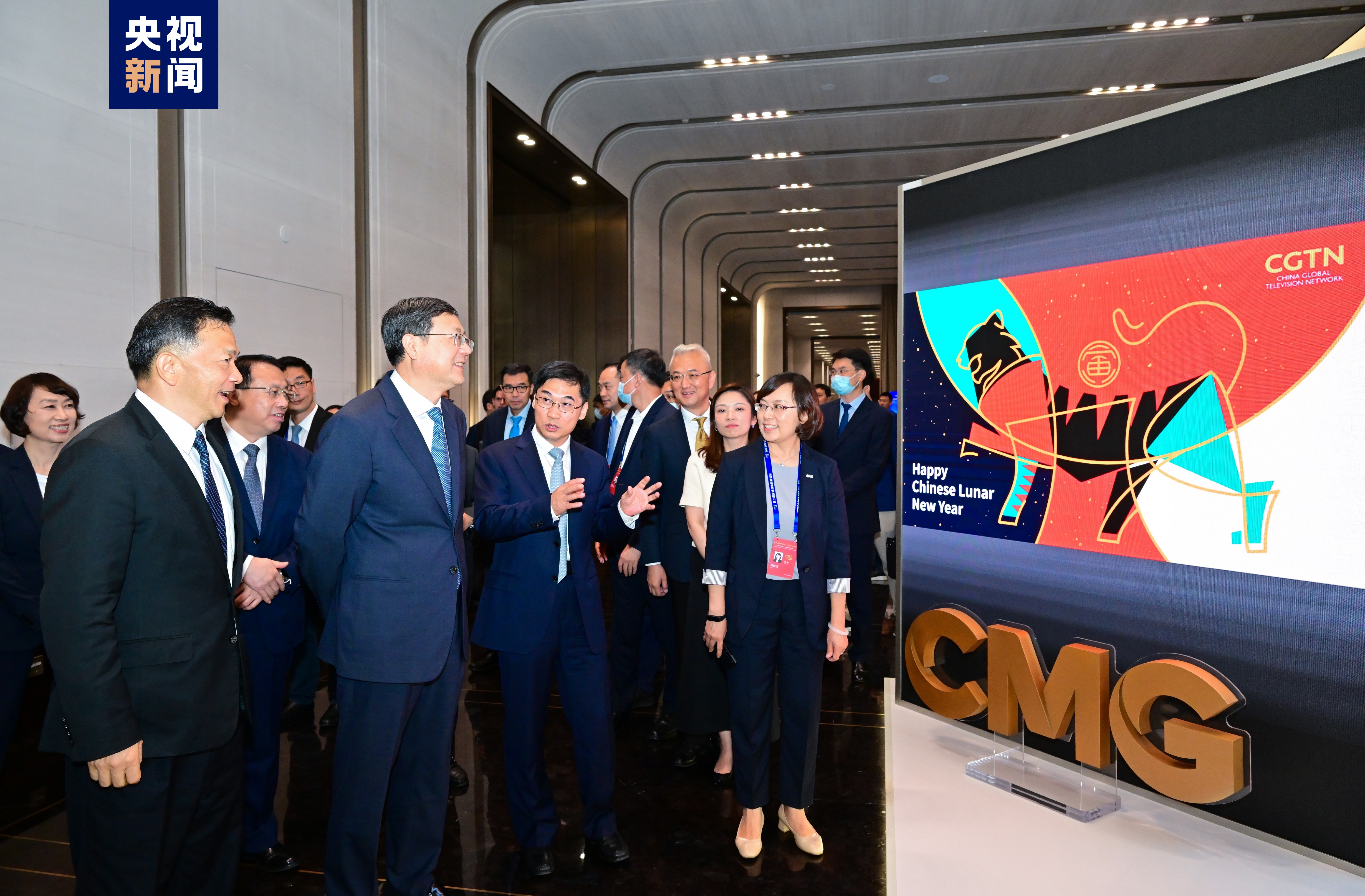 △陳吉寧和慎海雄、龔正等觀看中央廣播電視總台前沿科技成果及文創產品展示