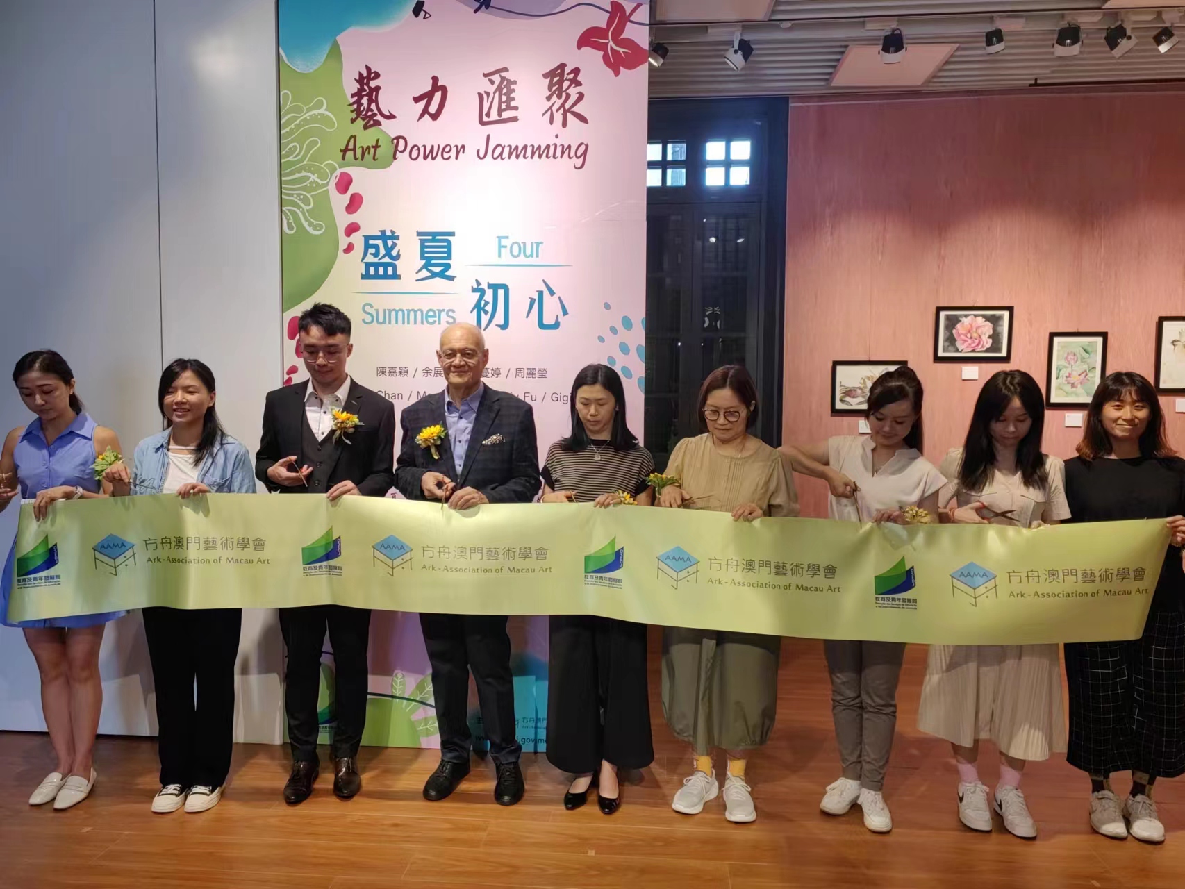 【即時新聞】由方舟澳門藝術學會舉辦、為期兩週的夏季主題展覽⸢盛夏.初心⸥ 四人聯展今日揭幕,展覽至8月6日假塔石廣場青少年展藝館展出四名年輕女藝術家陳嘉穎、余展晴、符蔓婷及周麗瑩共25幅原創作品,期望藉由不同媒材的創作,呈現她們各自的盛夏,讓參觀者揭開她們對藝術創作的初心。