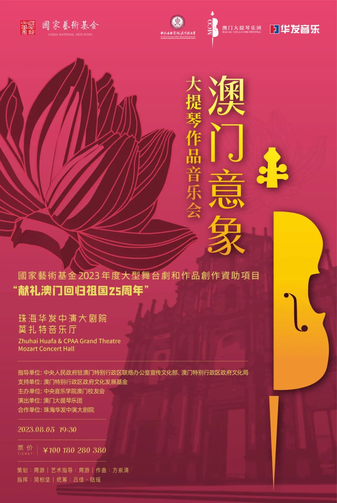 2023年,澳門即將再添一個新的文化藝術符號。由中央音樂學院澳門校友會委約中國著名青年作曲家方崠清先生創作的大型大提琴音樂作品《澳門意象》,將於2023年8月5日19:30,由澳門大提琴樂團在珠海華髮中演大劇院全球首演。這部作品是2023年度國家藝術基金資助項目,特別獻禮澳門回歸祖國 25 周年。