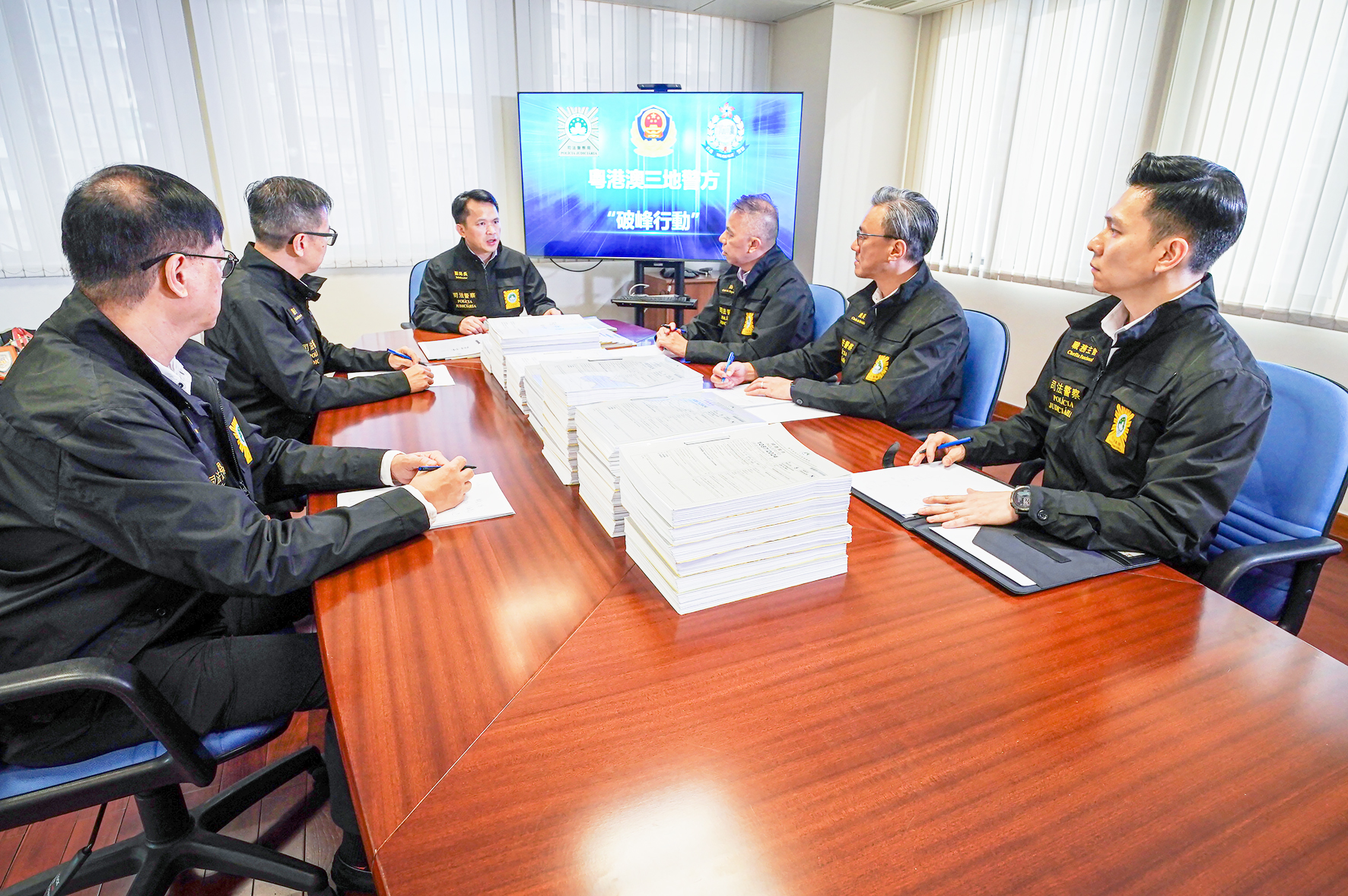 經分析部署和啟動警務合作機制,三地警方相互交流情報後,決定於上週六開展收網行動,其中司警出動200多名刑偵人員,在澳門、路氹及路環多個住宅單位拘捕50名涉案人士,檢獲800多萬元現金贓款、103部手提電話、26部電腦,賭桌及多張麻雀桌大量相關作案證據,並搗破涉案集團成員在黑沙環區一個商場內以咖啡廳作掩飾,不法經營德州撲克及麻雀的賭檔,為掩人耳目,該賭檔並非恆常運作,只有達一定數量的賭客時才會運作經營;而內地警方則拘捕42名內地居民,包括38男4女,凍結92個銀行帳戶,資金總額逾2200萬人民幣,涉及波纜數不少於8000萬人民幣;香港警方在屯門拘捕1名曾協助集團收受賭資逾800萬港元的香港居民。