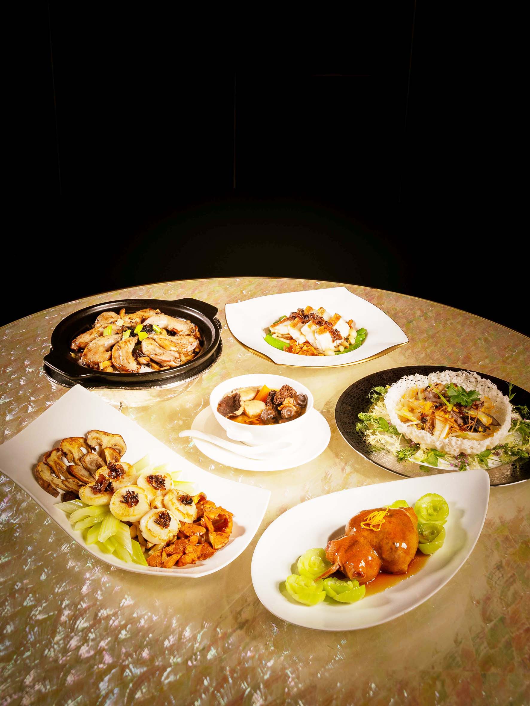 另一道特色菜餚八寶鮮菌釀葫蘆鴿,靈感來自於清朝康熙和乾隆皇帝所喜的宮廷菜。這道佳餚的名字源於其獨特的造型,宛如象徵好運的「葫蘆」。精巧刀工將乳鴿去骨留皮後綁緊,形成「葫蘆」形狀。隨後在鴿肚釀入新鮮羊肚菌、鮮黃耳、新鮮花菇、牛肝菌等多款新鮮菌菇,與栗子、糯米和蛋黃一起蒸熟,然後煎至金黃色。整道葫蘆鴿外皮酥脆、內餡綿軟,香氣四溢。