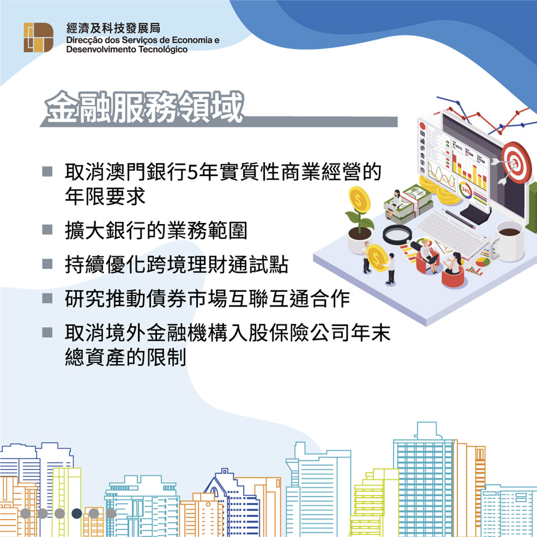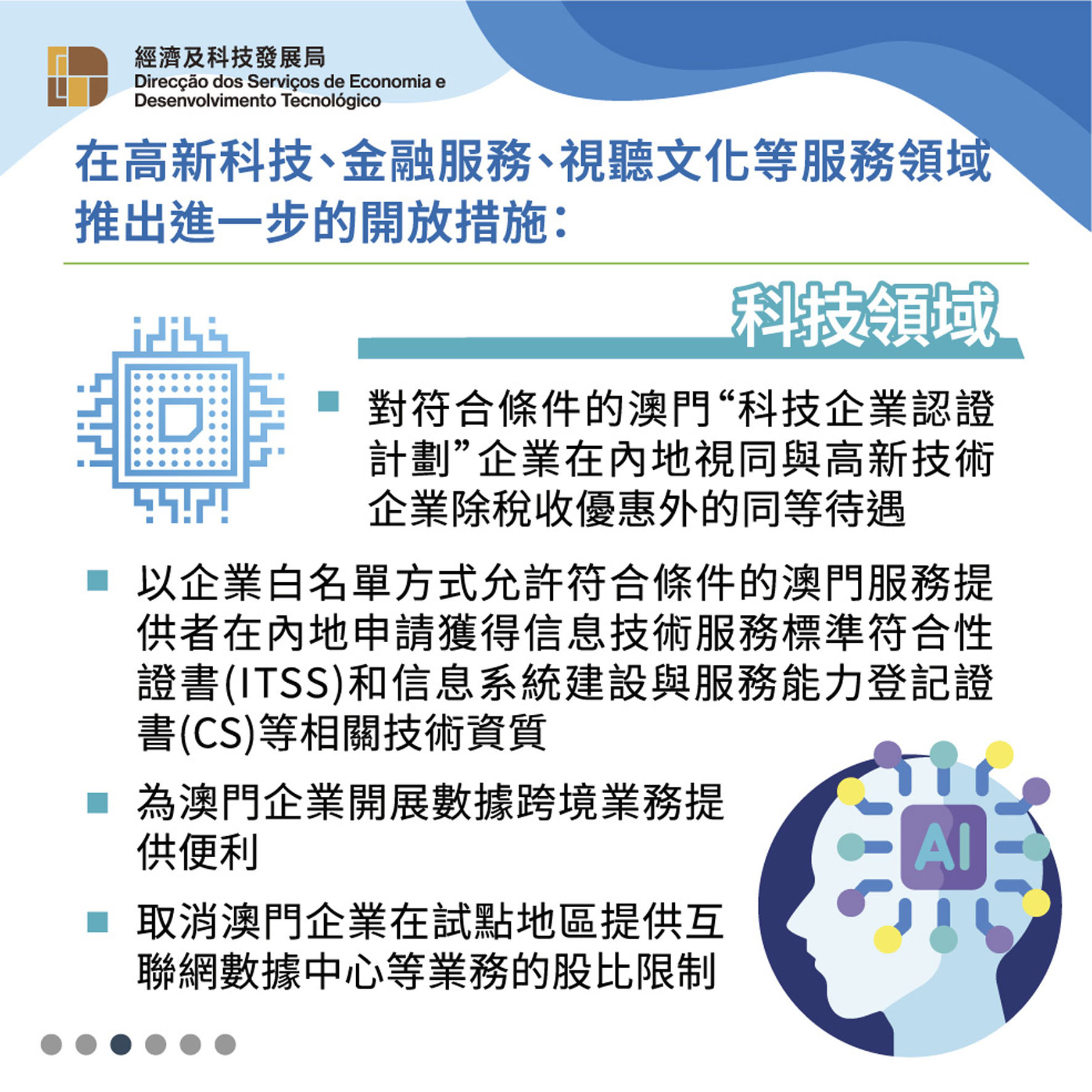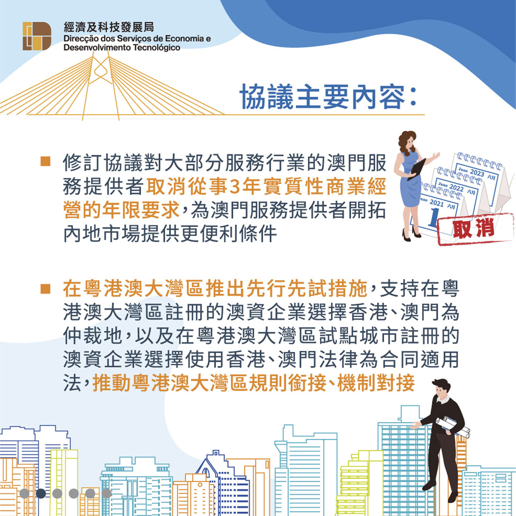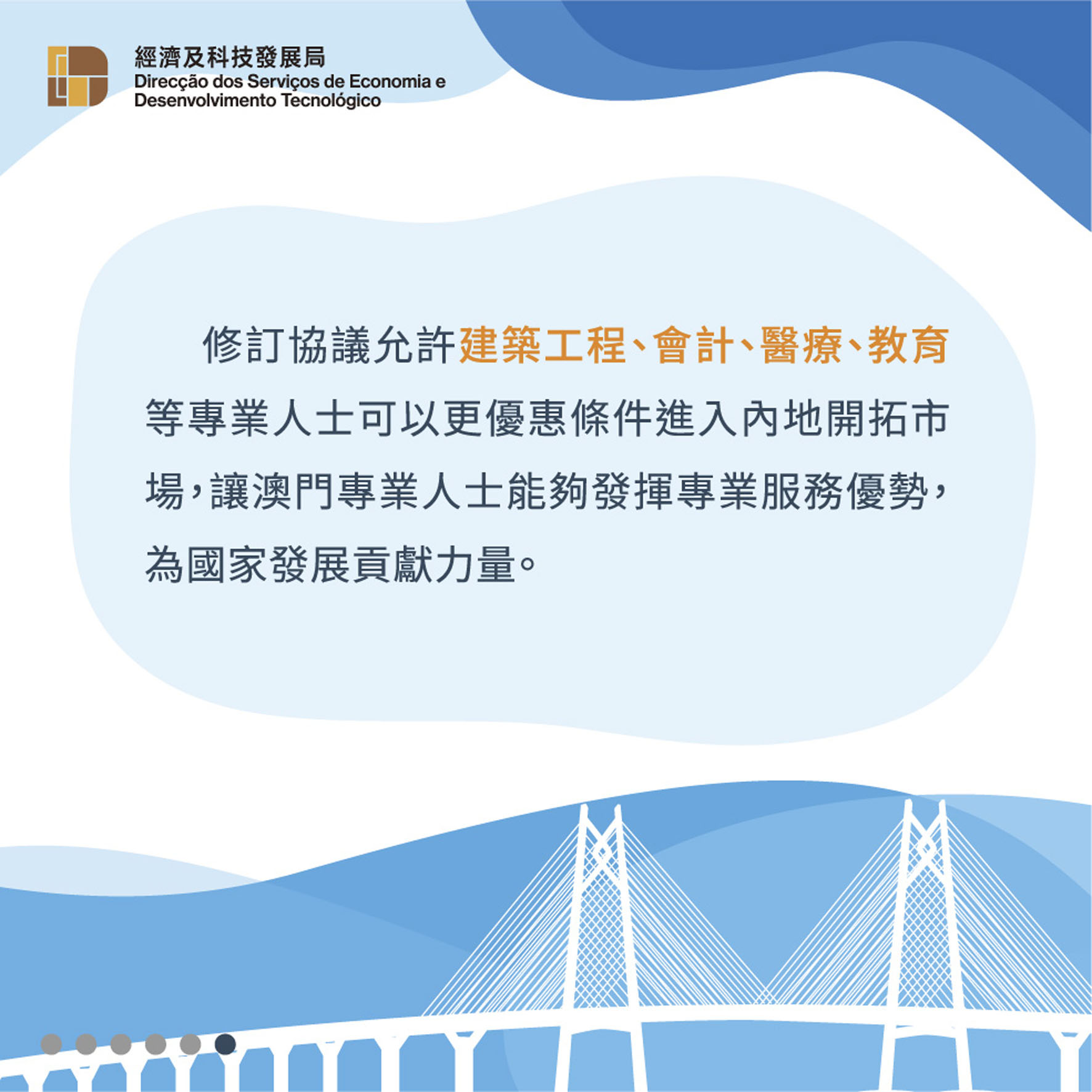 《修訂協議二》還增加高新科技、金融服務、視聽文化等服務領域的開放措施,支持澳門「1+4」適度多元發展策略,為澳門經濟適度多元發展創造新空間。科技領域方面,對符合條件的澳門「科技企業認證計劃」企業在內地視同與高新技術企業除稅收優惠外的同等待遇、允許符合條件的澳門服務提供者在內地獲得相關技術資質認可、取消澳門企業在試點地區提供互聯網數據中心等業務的股比限制等。金融服務領域方面,取消澳門銀行5年實質性商業經營的年限要求及境外金融機構入股保險公司年末總資產的限制等。視聽文化領域方面,允許澳門企業投資電影製作、與內地合拍電視劇可視為國產電視劇播出和發行等。此外,《修訂協議二》進一步提升對澳門專業服務的開放水平,允許建築工程、會計、醫療、教育等專業人士可以更優惠條件進入內地市場。