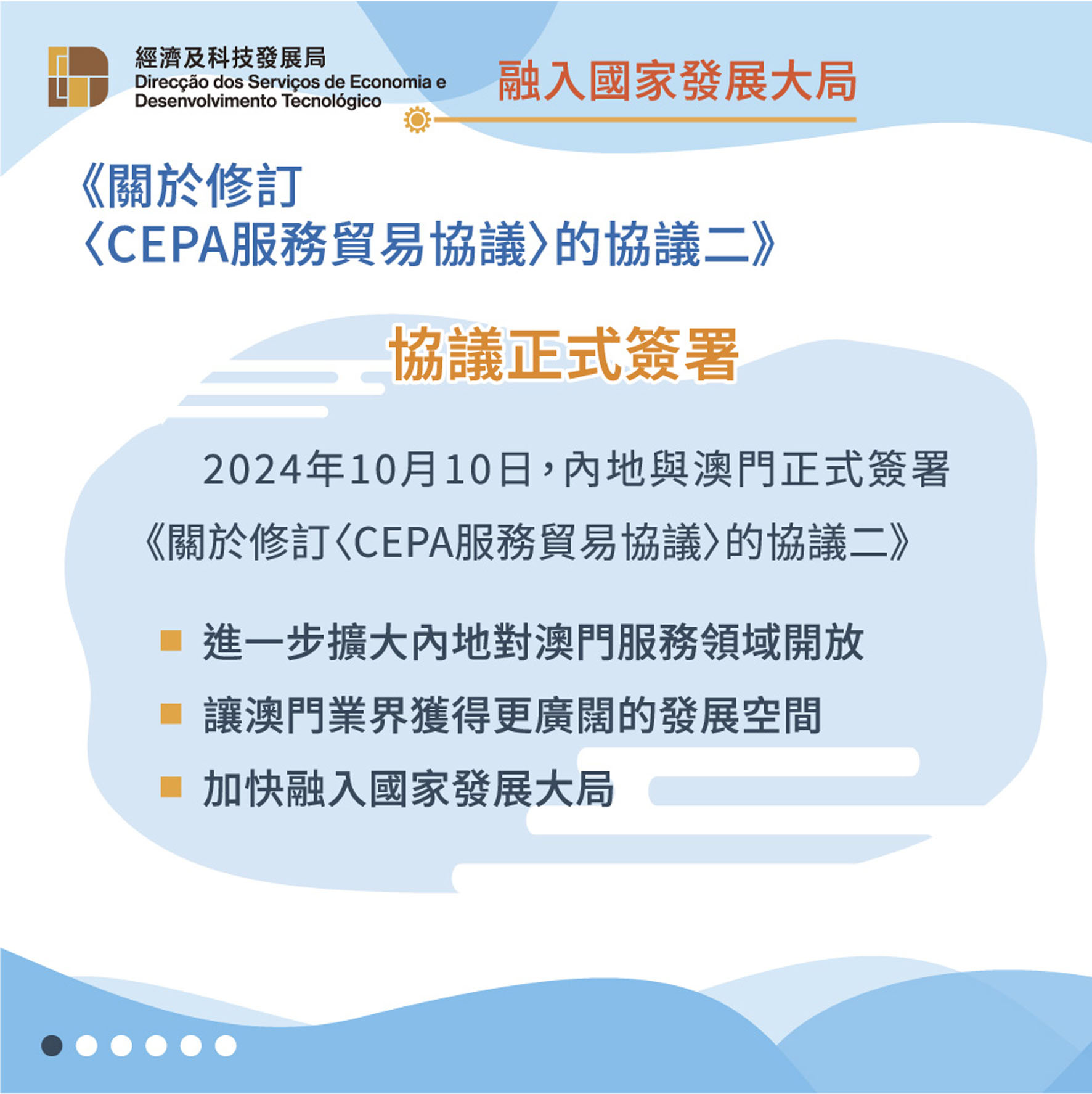 【特訊】國家商務部國際貿易談判副代表李詠箑(副部長級)與經濟財政司司長李偉農昨在澳簽署《關於修訂〈CEPA服務貿易協議〉的協議二》(《修訂協議二》),自簽署日起生效,將於2025年3月1日起正式實施。將有助進一步深化兩地經貿交流合作,加快推動粵港澳大灣區建設,以及促進澳門經濟適度多元發展,並為澳門業界融入國家發展大局創設了更有利的條件。