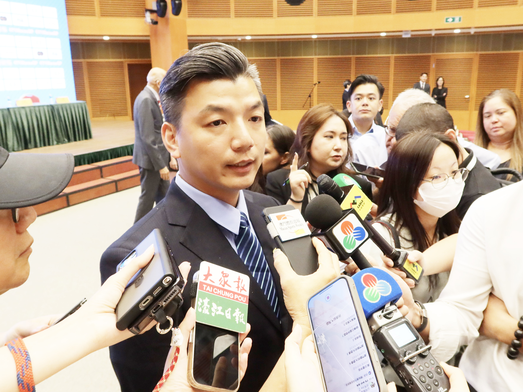 澳門格蘭披治大賽車組織委員會昨日中午十二時假科學館會議廳舉行新聞發佈會,公佈賽事及贊助商等資訊。體育局局長及大賽車組委會協調員張子軒、中國—澳門汽車總會會員大會主席及大賽車組委會賽事專責小組組長鍾國榮、澳娛綜合度假股份有限公司秘書長官樂怡、銀河娛樂集團企業事務董事林志成、金沙中國有限公司行政副主席王英偉、美高梅中國控股有限公司總裁及執行董事馮小峰、新濠博亞娛樂首席顧問黃昇雄、永利澳門有限公司財務及行政事務總裁郭富隆、大賽車組委會助理協調員李詩靈、大賽車組委會委員及專責小組成員、其他贊助商代表以及體育委員等出席。