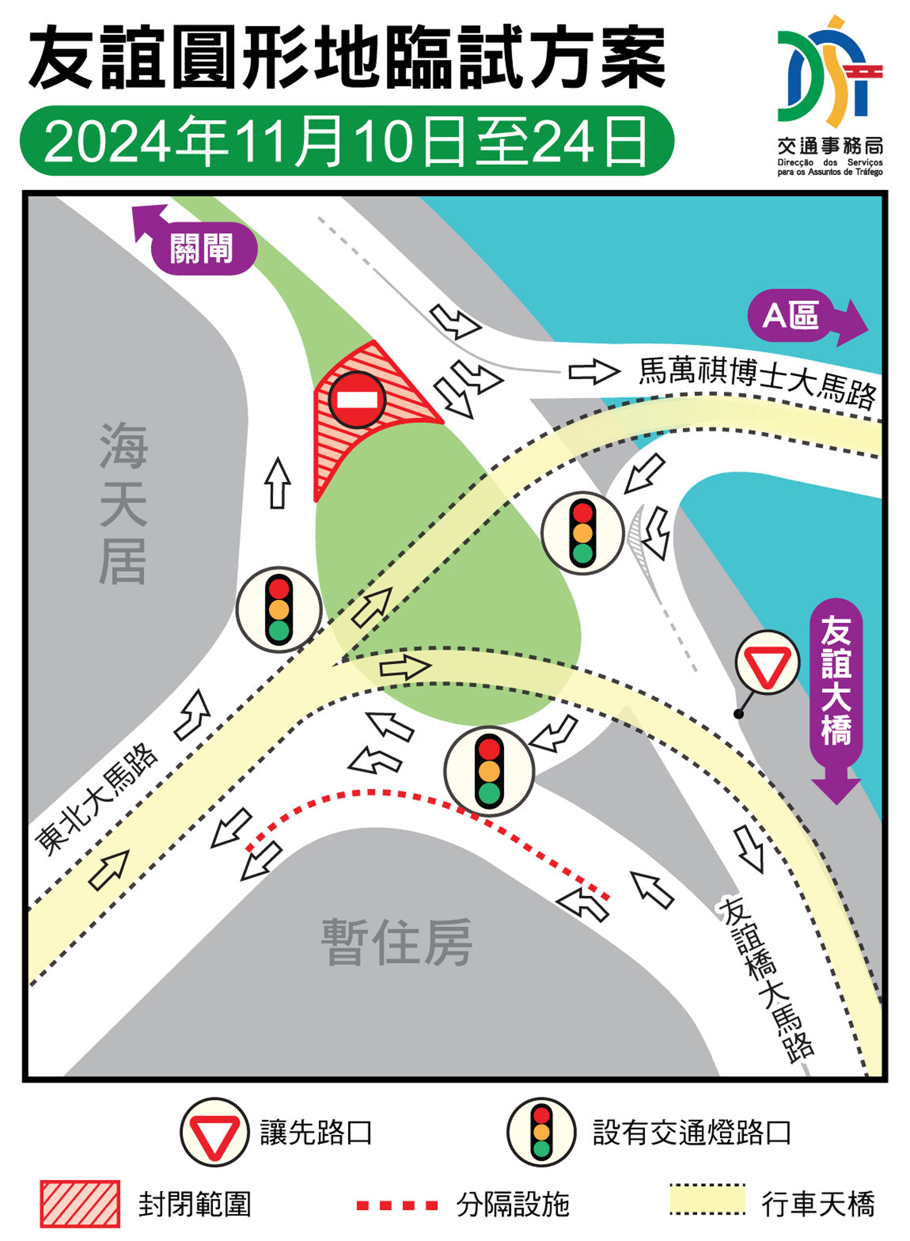 友誼圓形地實施臨時交通措施,如需前往新城A區或氹仔方向,需繞經勞動節街、黑沙環中街和東北大馬路前往友誼圓形地行車天橋。局方會密切留意有關臨時試行方案的實施情況和成效,適時調整細節,以評估有關路段日後的恆常交通安排。
