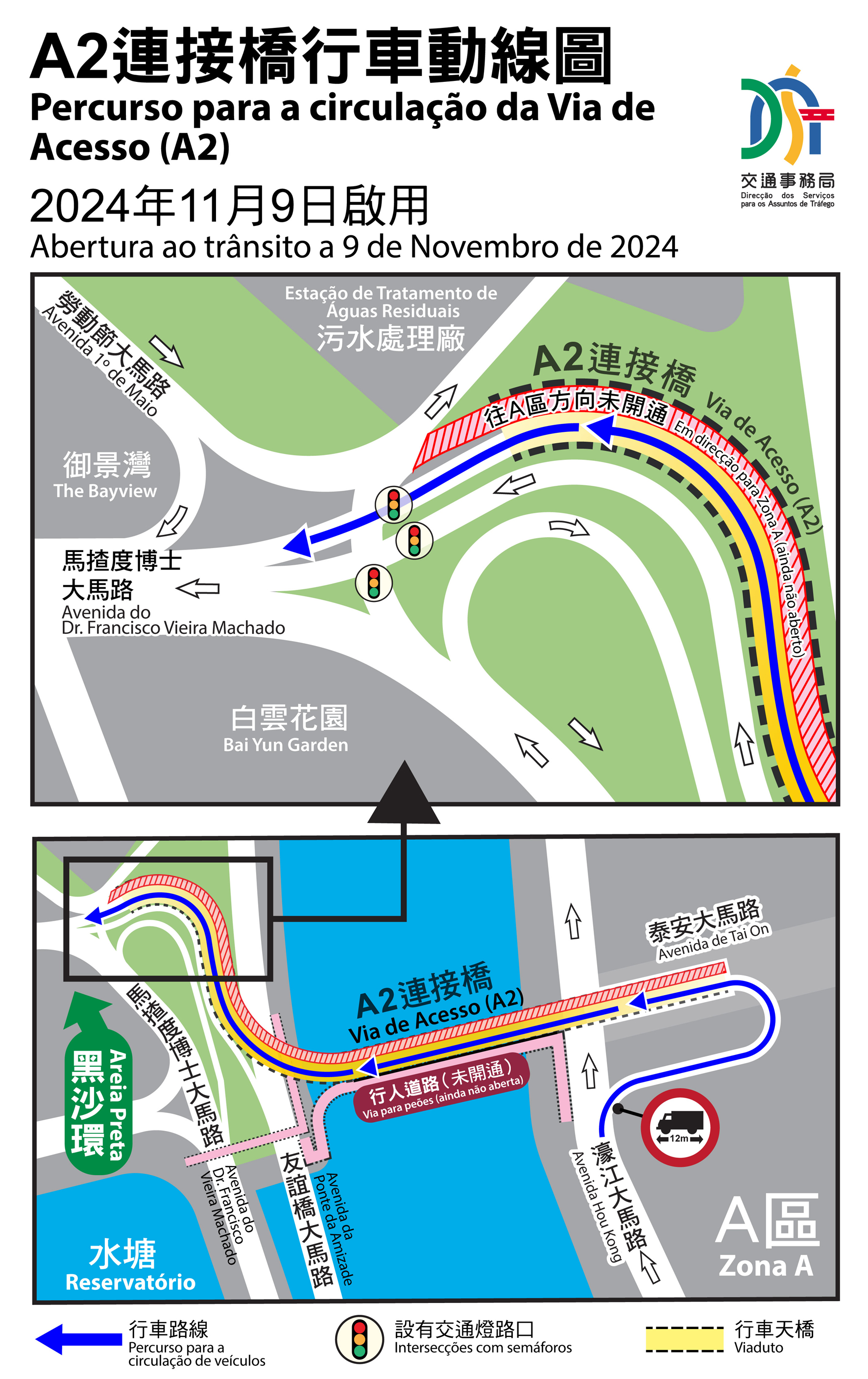 吳洪表示,為提升跨區通行能力及提前讓駕駛者在大賽車舉行前熟悉相關交通安排,A2橋將於11月9日(週六)開通由A區往澳門半島方向的車行道,屆時,車輛(僅限車長不超過12米車輛)可由濠江大馬路近泰安大馬路的入口進入A2橋,經設於馬楂度博士大馬路(介乎污水處理廠和白雲花園)的出口往澳門其他區域,具體請參閱行車安排示意圖。目前,由於泰安大馬路部份路段仍在進行共同管道及道路施工,故短期內車輛未能由澳門半島通往A區。A2橋由黑沙環往A區方向的車行道將配合A區工程的施工進度適時開放。同時,為避免由漁翁街及友誼大馬路來車與A2橋車流的衝突,局方在A2橋近馬楂度博士大馬路的出口增設交通燈控制路口,以控制北向和東西向的來車有序通行,而往馬楂度博士大馬路方向則不受燈控影響。