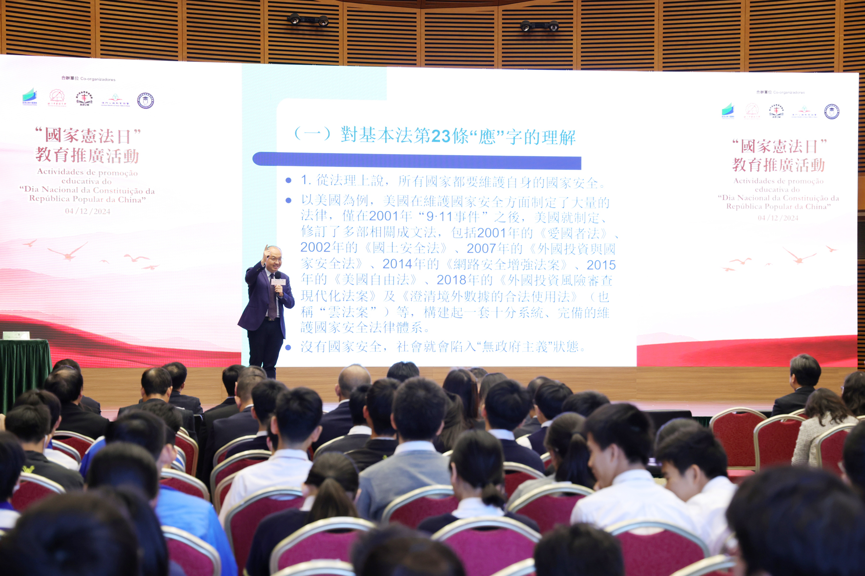 活動同時邀請澳門大學憲法與基本法研究中心副主任江華主講《維護國家安全是澳門特區的憲制責任》講座,分別從澳門特區的法律地位、「一國兩制」理論及中央管治權與特區自治權的關係三個方向闡述維護國家安全的重要性,以及澳門特區享有中央授予高度自治權的同時必須履行的相應責任和義務。