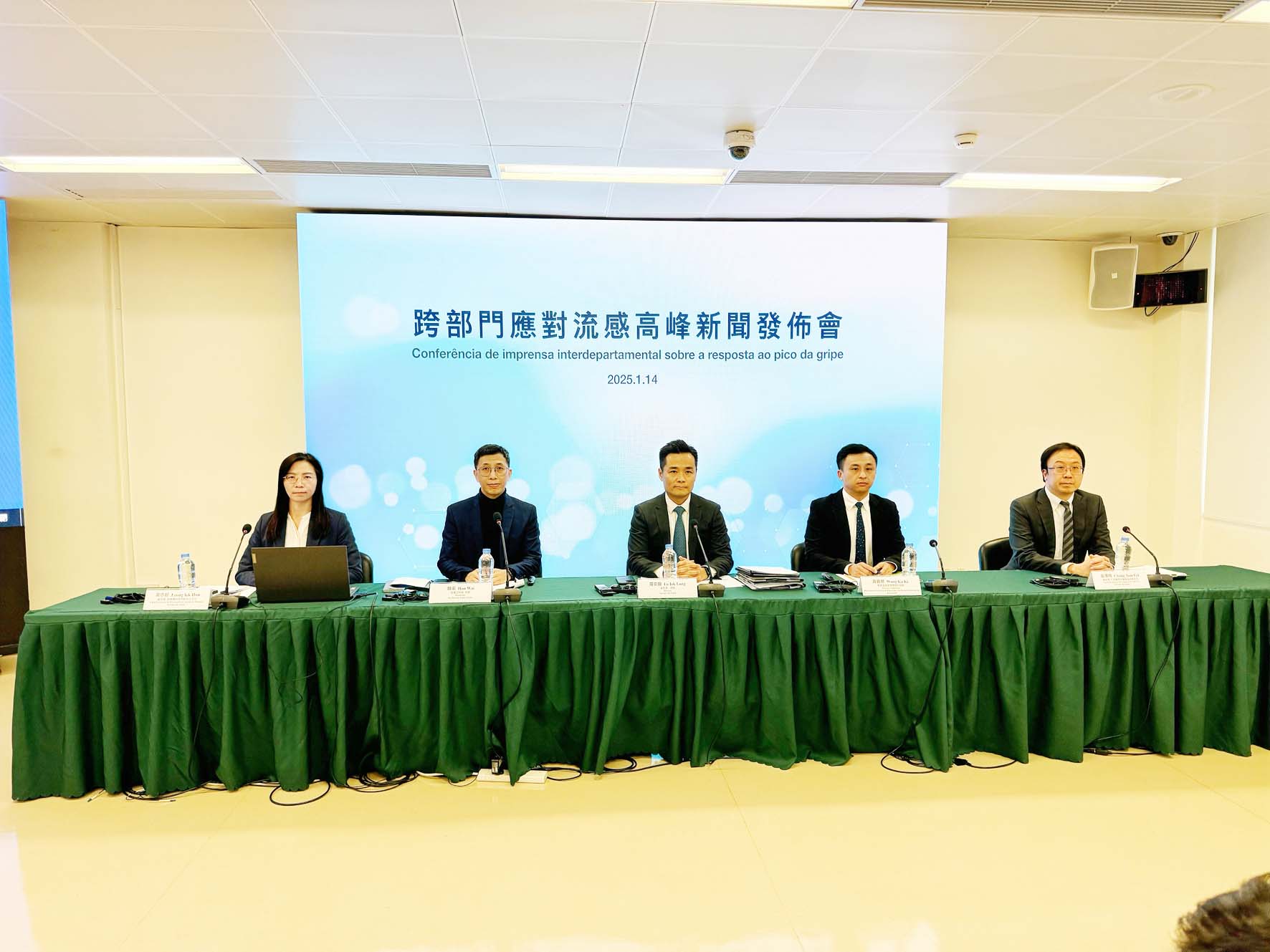 在行政長官領導下,社會文化司統籌協調下,衛生局、教青局、社會工作局昨日中午12時半假衛生局公共衛生應急人員宿舍5樓會議廳共同舉行跨部門應對流感高峰新聞發佈會。衛生局衛生局局長羅奕龍、社工局局長韓衛、教青局代局長黃嘉祺、疾控中心主任梁亦好、仁伯爵綜合醫院急診部主任曾潭飛出席,介紹未來計劃開展的一系列跨部門部署工作。