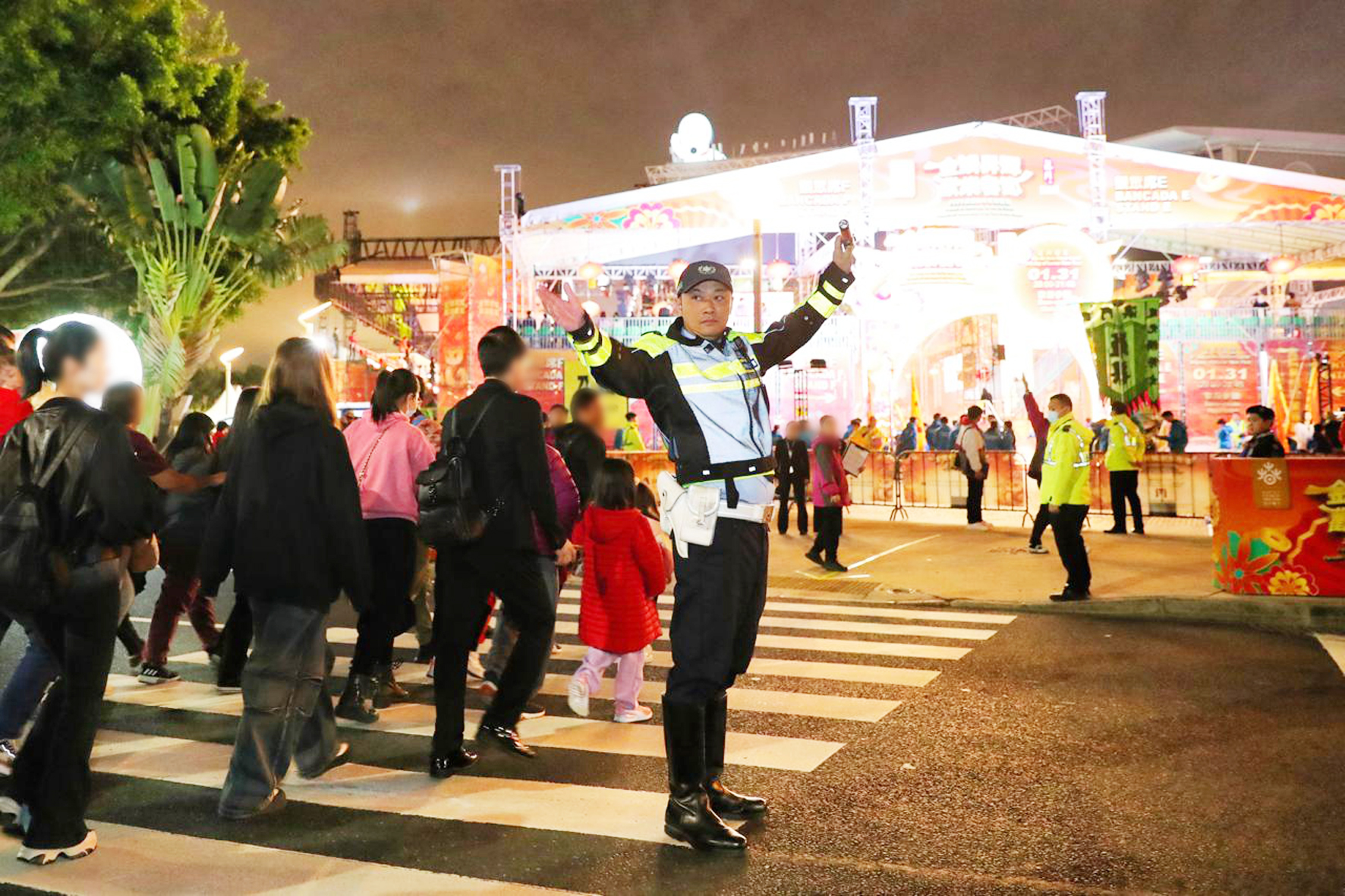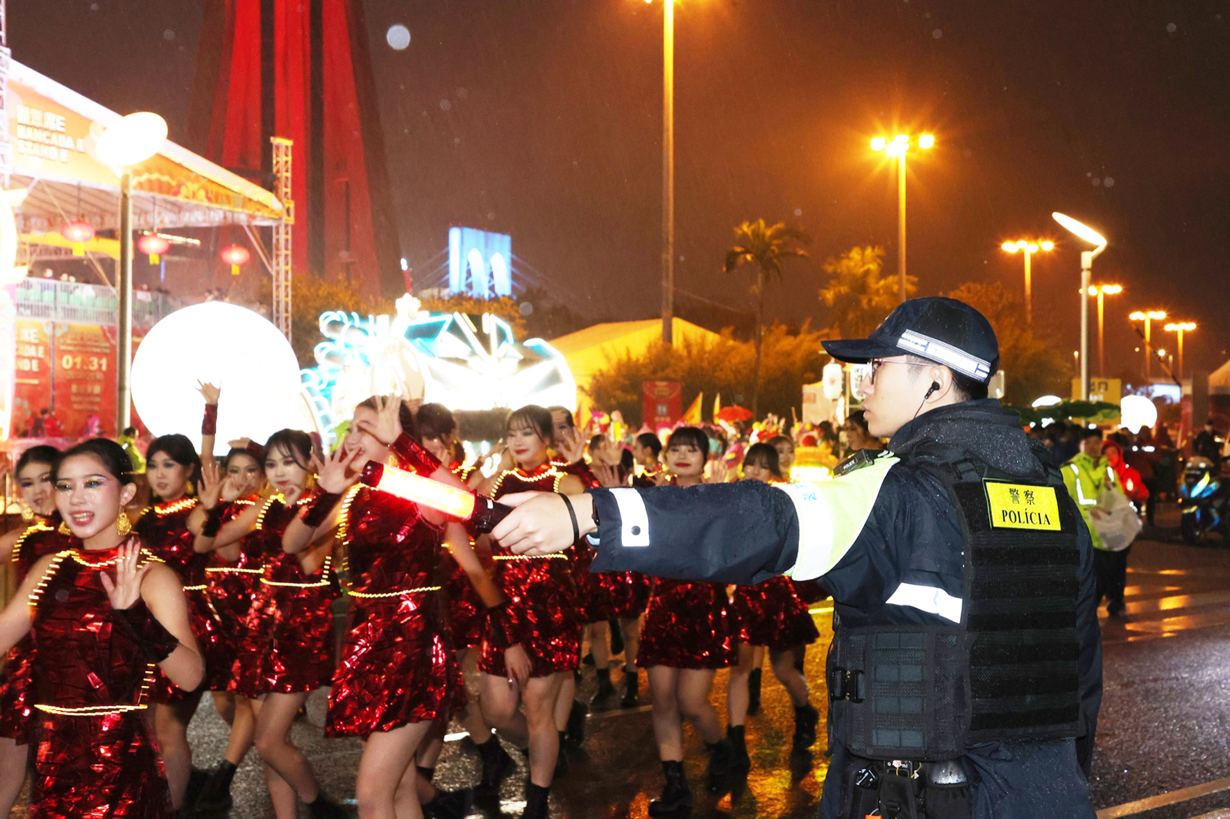 農曆新年大金龍巡遊、花車匯演和煙花表演期間,現場人潮湧動。治安警察局加派人手維持秩序,精準指揮交通,引導車輛有序通行、高效疏導人流。市民和旅客積極配合現場警員的引導,活動現場秩序井然,各項活動順利開展。