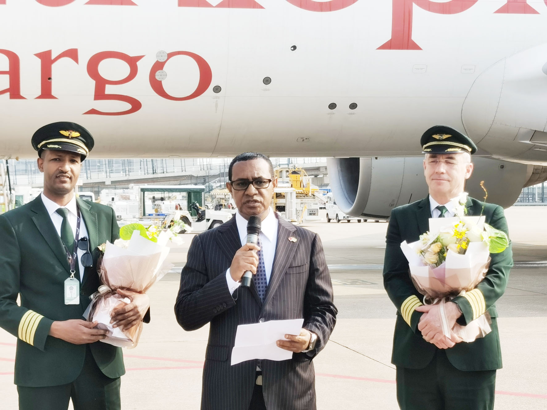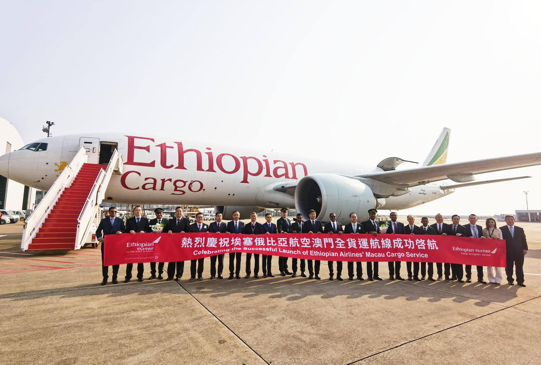 首航儀式於昨日早上8時在澳門國際機場停機坪舉行,貨機抵澳時並受到水門儀式的歡迎。埃塞俄比亞駐華大使特費拉‧德博,中聯辦經濟部副部長楊全州,外交部駐澳公署參贊付愛民,澳門民航局局長潘華健,埃塞俄比亞航空集團中國區總經理谷藹明,澳門國際機場專營公司執委會主席陳穎雄、執行董事李時泰,廣東橫琴澳門國際機場物流有限公司總經理趙友學,上海美凱航空服務有限公司董事總經理徐征,中聯辦經濟部二級調研員侯振坤,澳門招商局招商投資及經貿拓展事務廳高級經理周鵬,澳門中非商會商會長馬志達,澳門國際機場專營公司物流暨通用航空發展部總監胡漢新等嘉賓出席該航線的首航儀式。