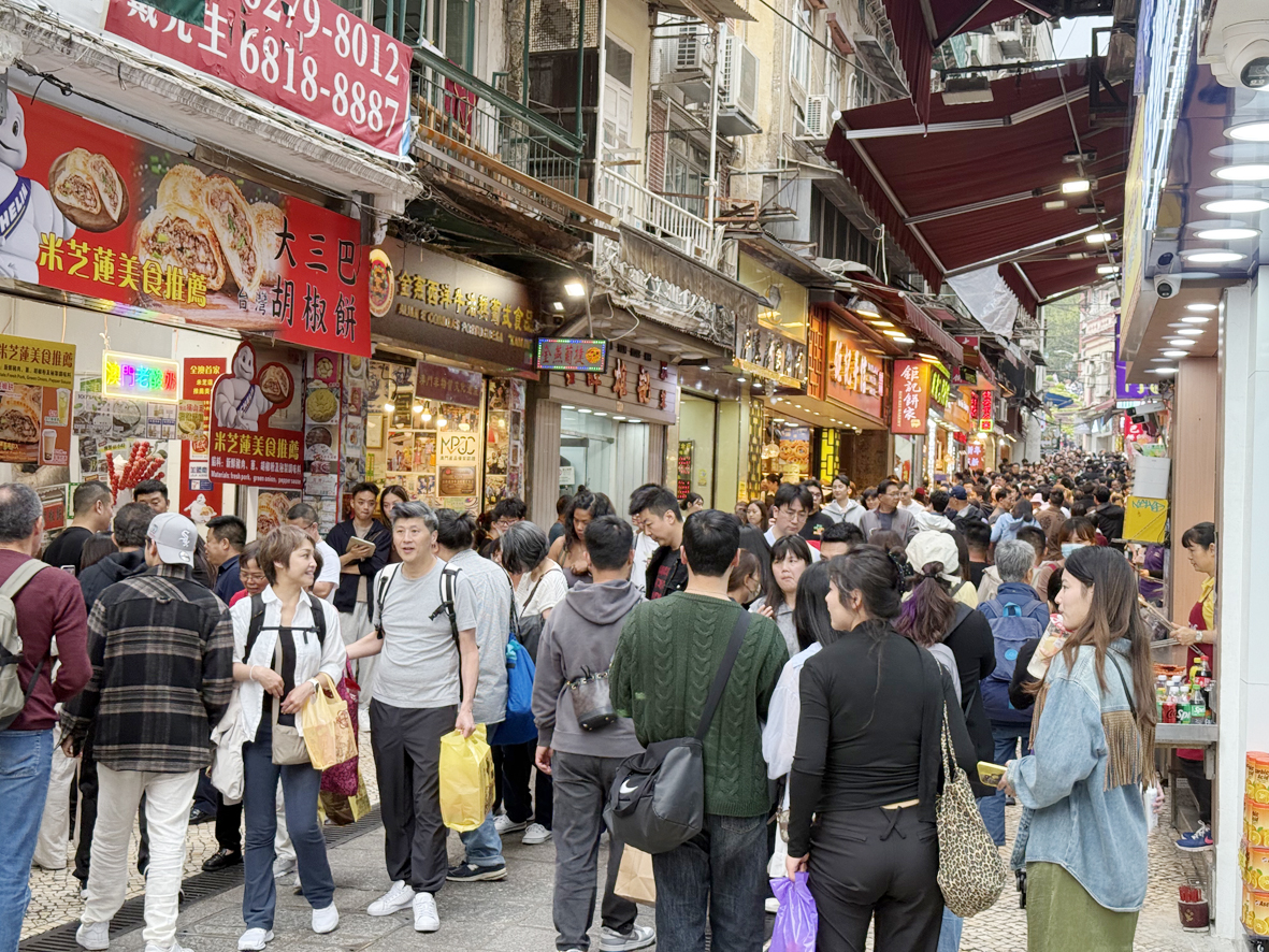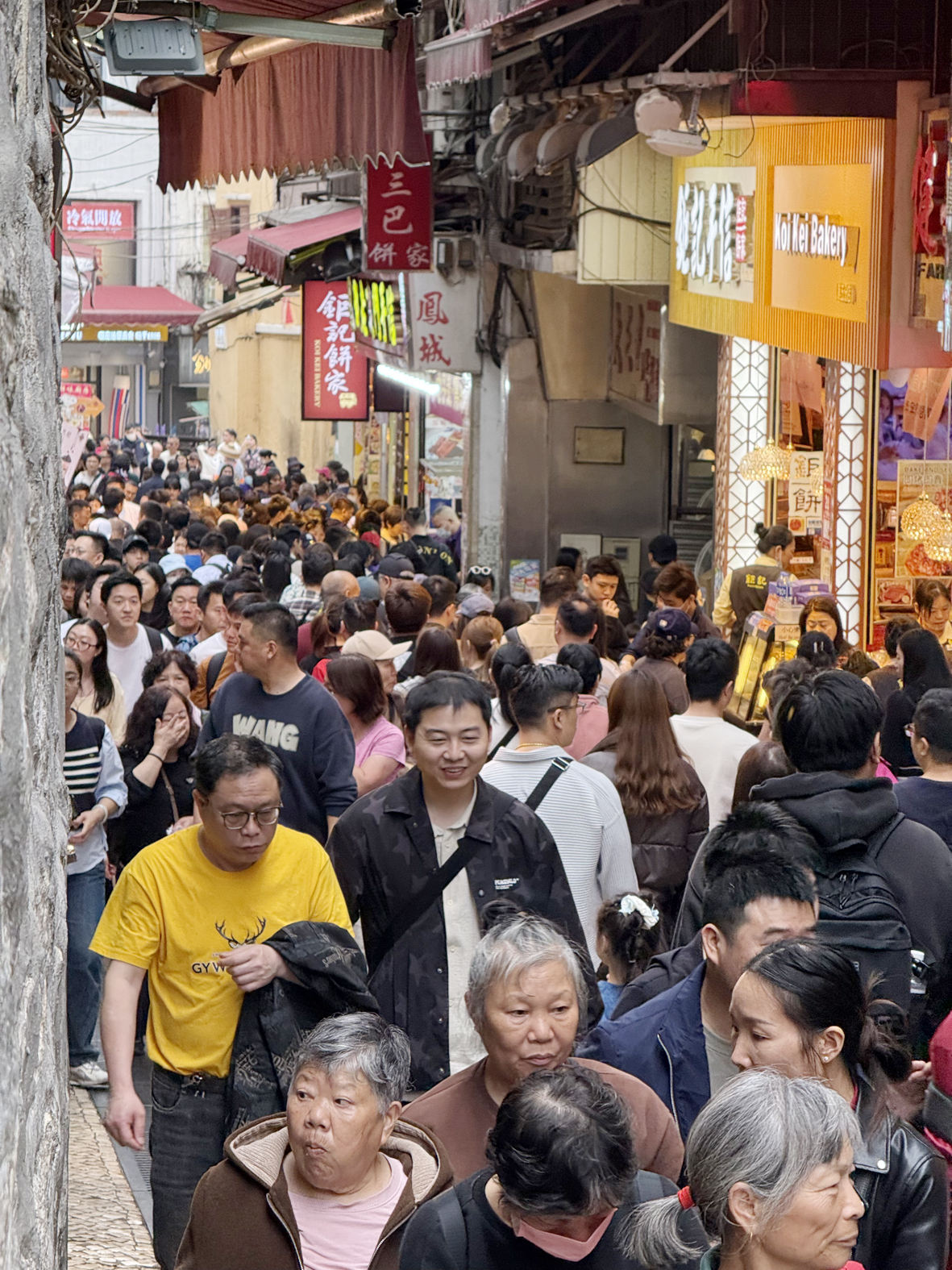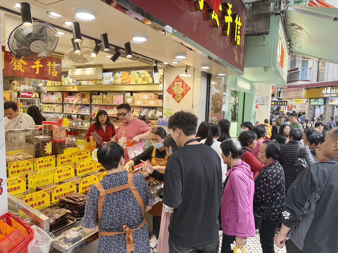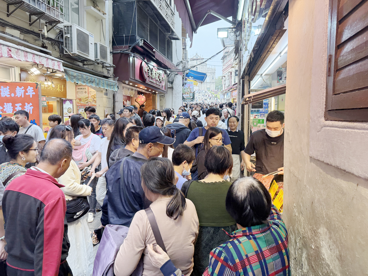有來自廣東的一家五口澳過清明假期,因前日天氣不好,擔心戶外活動受影響,選擇在室內的行程,昨日是假期最後一天,天氣轉好,特意趁最後一日來大三巴一帶參觀,順便購買手信及紀念品。認為一路手信店舖選擇眾多,會選價格便宜的,現在支付寶有消費立減活動,換算成匯率較為划算。