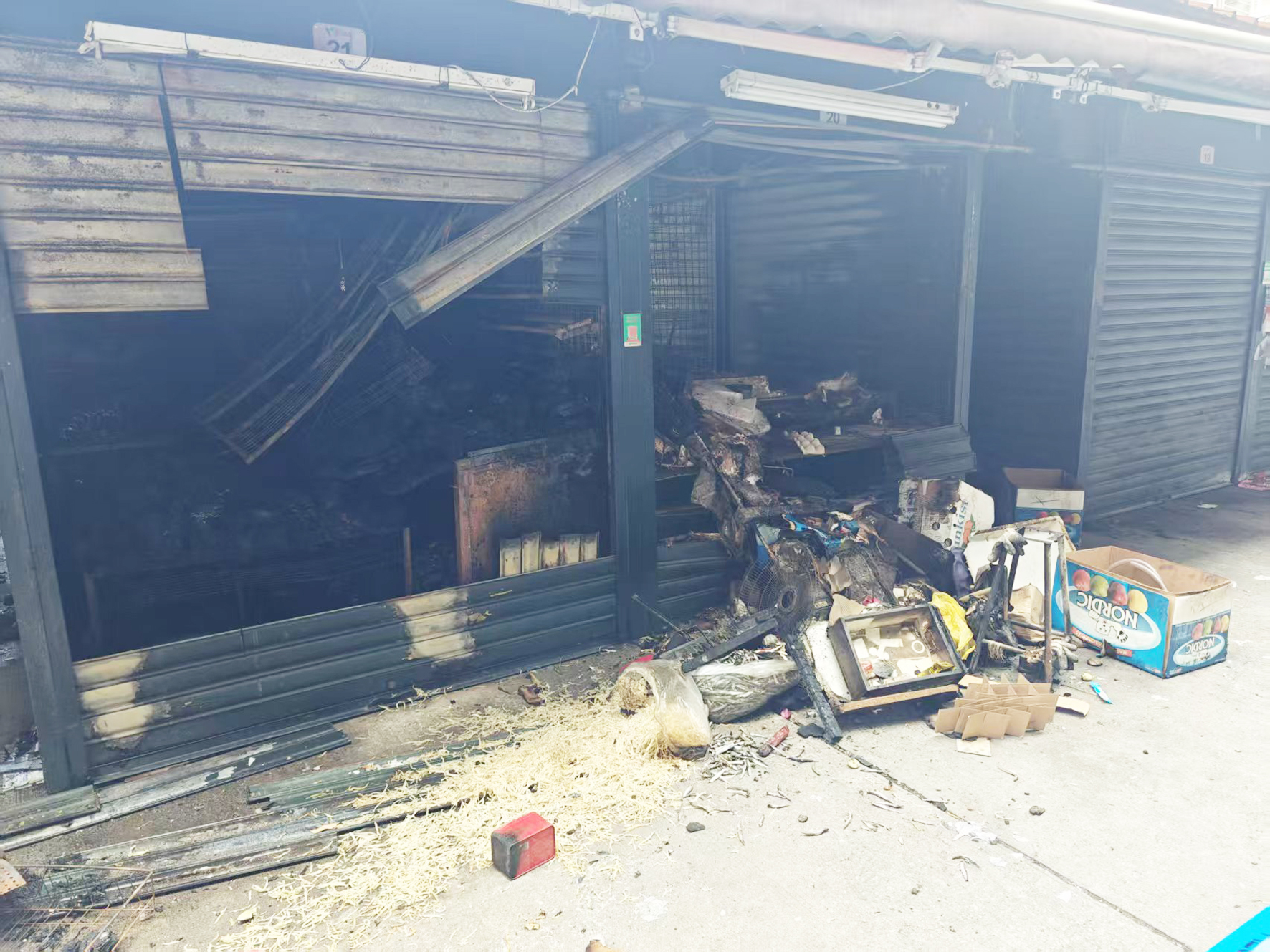 【特訊】市政署管委會主席周偉迎聯同小販、工程等部門主管人員昨日上午到發生火警的佑漢第二街小販區查看損毀情況,據現場所見,遭到火災波及的小販攤檔被警方用警戒線圍封,受災檔位被燒焦的貨物散落一地,發出異味,有街坊在場圍觀和議論,亦有警員在場維持秩序,未受火警影響的少數攤檔繼續開檔營業。
