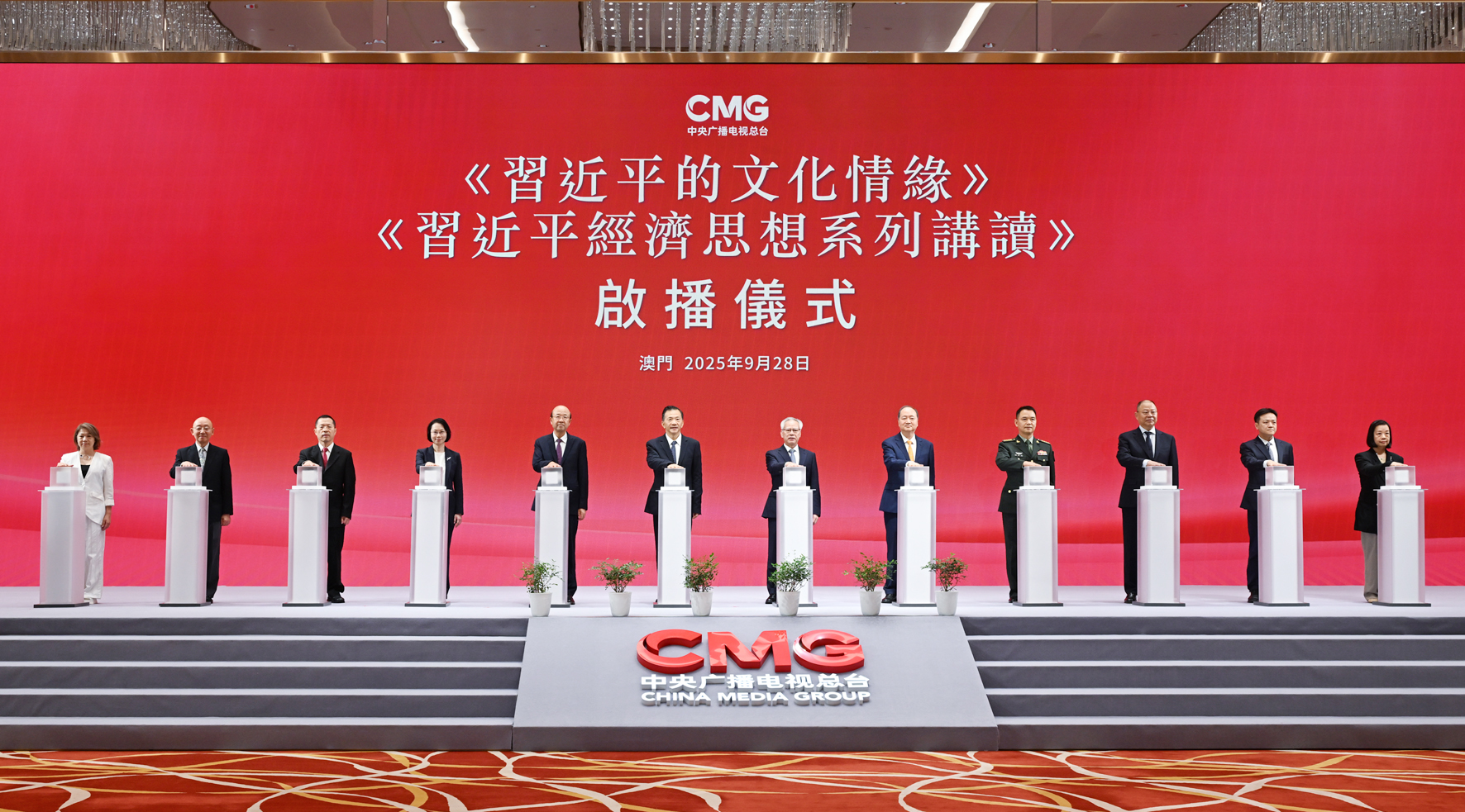 慎海雄致辭表示,精品節目《習近平的文化情緣》及《習近平經濟思想系列講讀》,是助力澳門各界更好學習領會領袖思想的一次生動實踐,是讓澳門居民深切感悟中華文明深厚底蘊和新時代偉大成就的一場文化盛宴。他指出,《習近平的文化情緣》精心選取習近平主席心繫文化傳承與發展的生動故事,展示習近平文化思想的精髓要義和習近平自我理政理念的深厚文化根基,生動詮釋「文化新、國運新,文化強、民主強」的價值理念。《習近平經濟思想系列講讀》精心選取習近平主席的重要講述,展現習近平經濟思想的時代特徵、理論價值和實踐偉力,共同探尋思想源頭,體悟思想魅力,領會思想智慧。中央廣播電視總台將與澳門特區政府和澳門各界持續深化合作,凝聚起澳門居民愛國愛澳的強大力量。