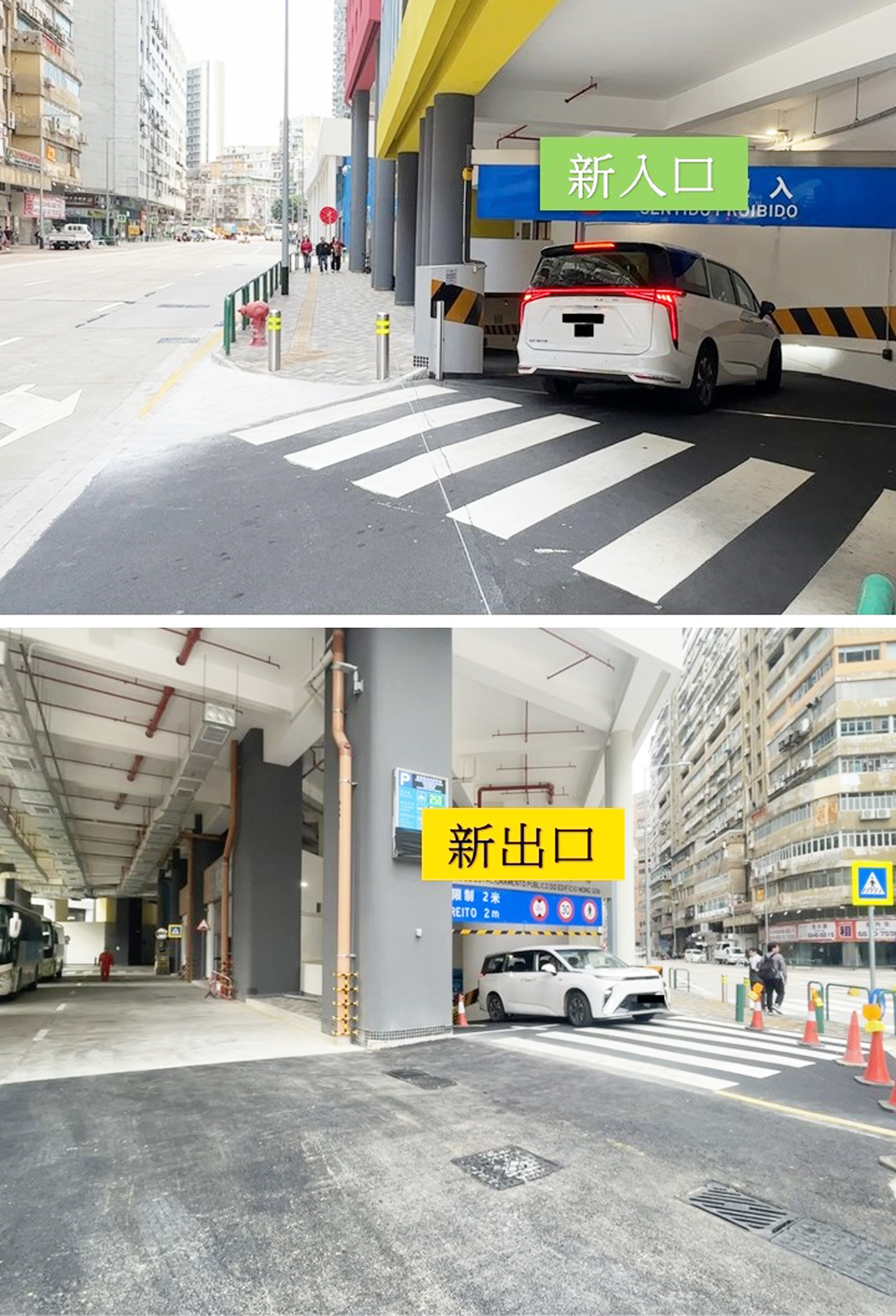 新安排下,車輛將改由近政府綜合服務中心(望信樓第2座)的原有出口位置進場,並透過近望信樓第1座的原有入口位置離開。新設計讓駛離車輛可經內街轉入慕拉士大馬路,使出口位置與路口保持約50米的緩衝距離,並可讓駕駛者選擇轉線駛往東北大馬路,從而提升行車效率。隨著第一階段工程完成,交通事務局接續將優化出口處的行人路,並設置分隔設施,避免車輛出車後與行人動線交疊,保障行人安全,工程預計於12月8日完成。