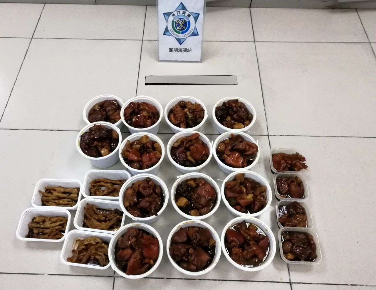 2025年12月30日及31日,海關人員透過風險管理系統的預警佈控,在關閘口岸和港珠澳大橋澳門口岸的入境車道分別截查兩輛跨境車輛,駕駛者均為男性澳門居民,經檢查,發現該兩人試圖將合共400盒盒裝即食花膠鮑魚及27.5公斤未經檢疫熟食偷運入境。
