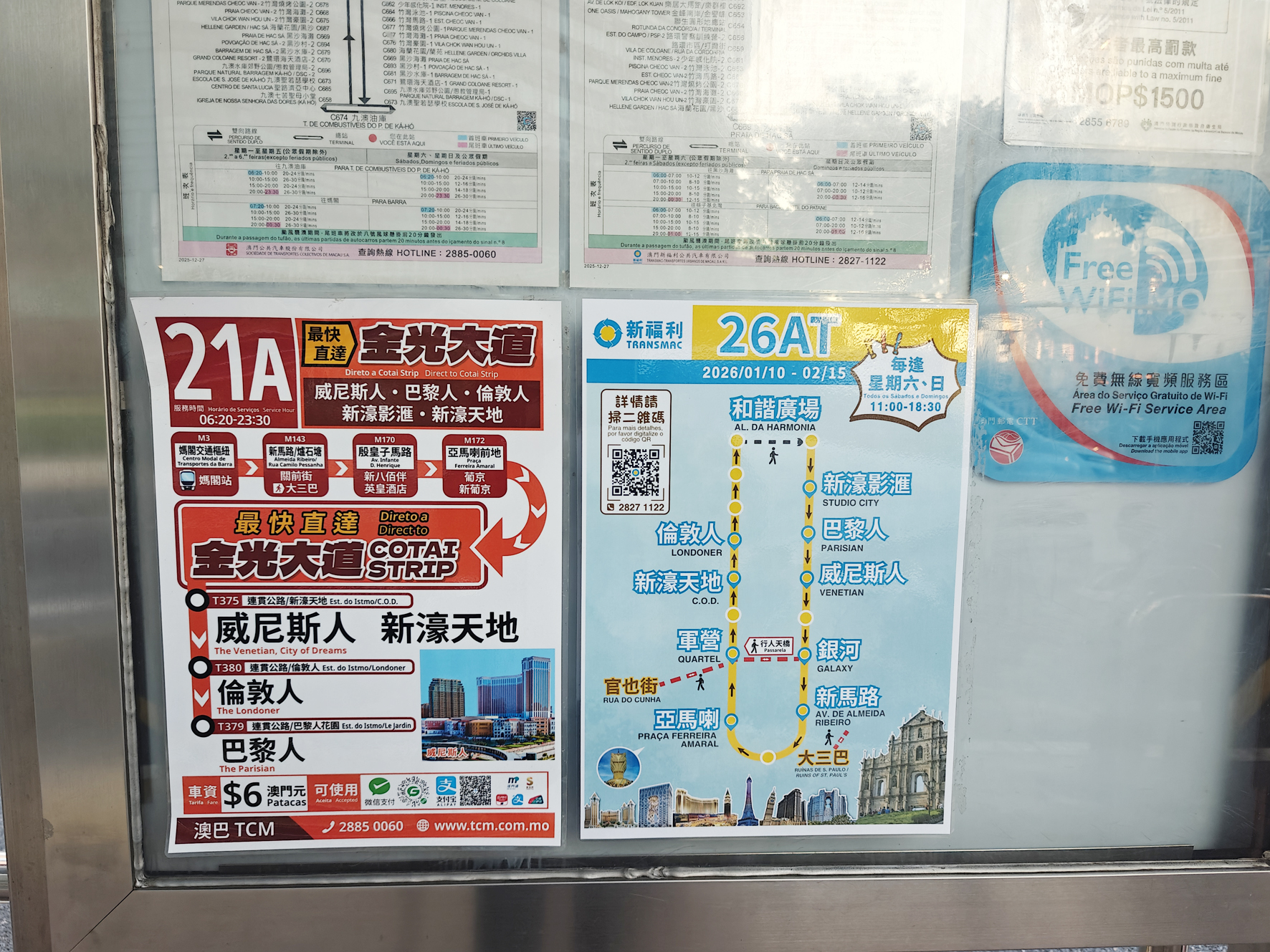 據悉,21AT為循環路線,由本月10日起至2月8日期間逢週六、日營運,營運時間為上午10時至晚上7時,班次頻率為10至20分鐘一班,從「媽閣交通樞紐」站出發,途經「新馬路/爐石塘」站、「殷皇子馬路」站、「亞馬喇前地」站、「連貫公路/新濠影匯」站、「連貫公路/巴黎人」站、「連貫公路/威尼斯人」站、其後返回「亞馬喇前地」站、「中區/殷皇子馬路」站及「媽閣交通樞紐」站;26AT同樣為循環路線,於本月10日起至2月15日期間逢週六、日營運,營運時間上午11時至下午6時半,班次頻率為15至30分鐘一班,由「和諧廣場/樂群樓」站發車,途經「連貫公路/新濠影匯」站、「連貫公路/巴黎人」站、「連貫公路/威尼斯人」站、「望德聖母灣馬路/連貫公路」站、「排角/銀河」站、「新馬路/爐石塘」站、「殷皇子馬路」站、「亞馬喇前地」站、「望德聖母灣馬路/軍營」站、「望德聖母灣馬路/紅樹林」站、「連貫公路/新濠天地」站、「連貫公路/倫敦人」站、「連貫公路/巴黎人花園」站、「蓮花圓形地」站及「和諧廣場/業興大廈」站。