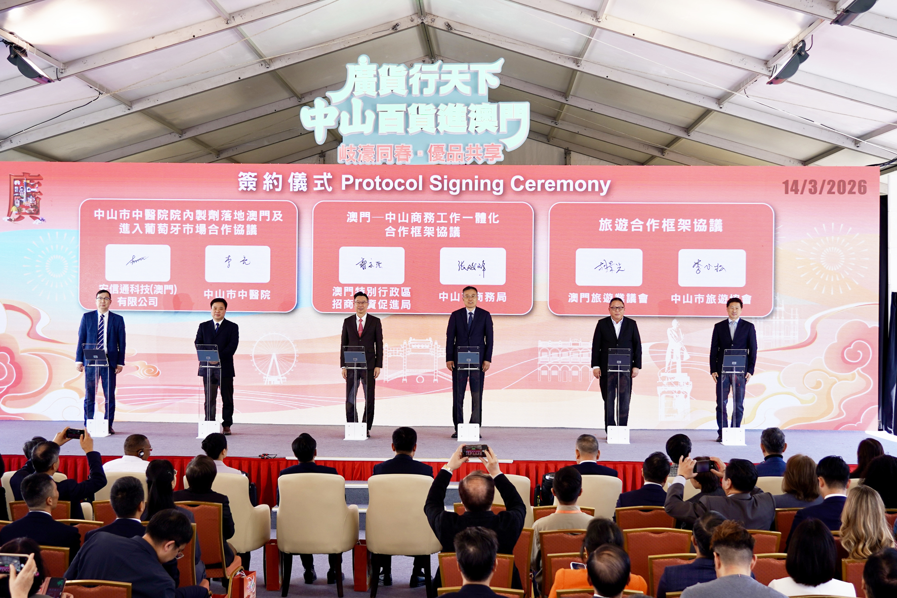 同場進行簽約儀式,簽約項目精準對接商務合作、醫療出海、旅遊聯動三大核心領域,包括中山市商務局與澳門招商投資促進局簽訂「澳門—中山商務工作一體化合作框架協議」,中山市中醫院和澳門科技大學簽訂「中山市中醫院院內制劑落地澳門及進入葡萄牙市場合作協議」,中山市旅遊協會和澳門旅遊業議會簽訂「旅遊合作框架協議」。