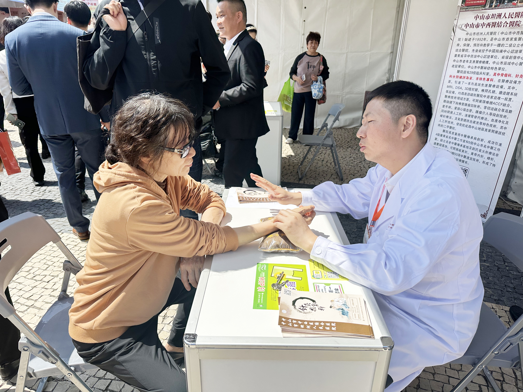 「文旅中山」設15個展位,並有專人派發文旅手冊,詳盡解說「澳門—中山主題聯游線路」;「康養中山」14個展位前不時排起小長隊,資深中醫師現場把脈、推拿,開展針灸體驗,推廣中山「康養+文旅」特色線路;「美味中山」設中山香農展區,各類農副產品琳瑯滿目,美食集市彙集石岐乳鴿、魚餅等現烹特色美食,香氣四溢。
